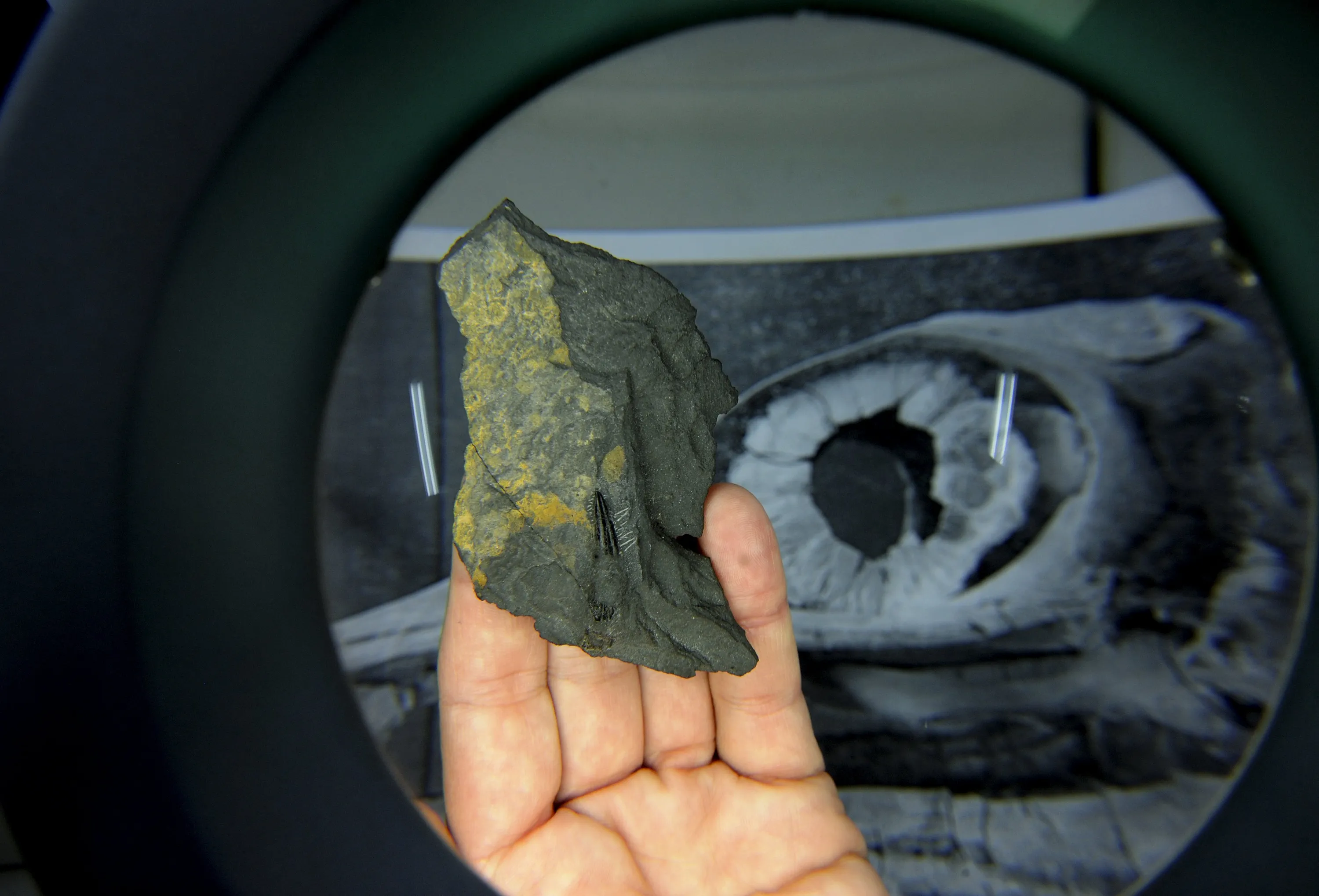 The fossil tooth of a Ichthyosaur is seen through a magnifying glass at the headquarters of the Jurassic Museum of Asturias (MUJA) in Colunga, northern Spain, November 6, 2015. The scientific team of the Jurassic Museum of Asturias (MUJA) presents their latest studies on the fossil of a Ichthyosaur, which acccording to them is the most complete found in the Iberian Peninsula and one of the few in the world. (Photo by Eloy Alonso/Reuters)