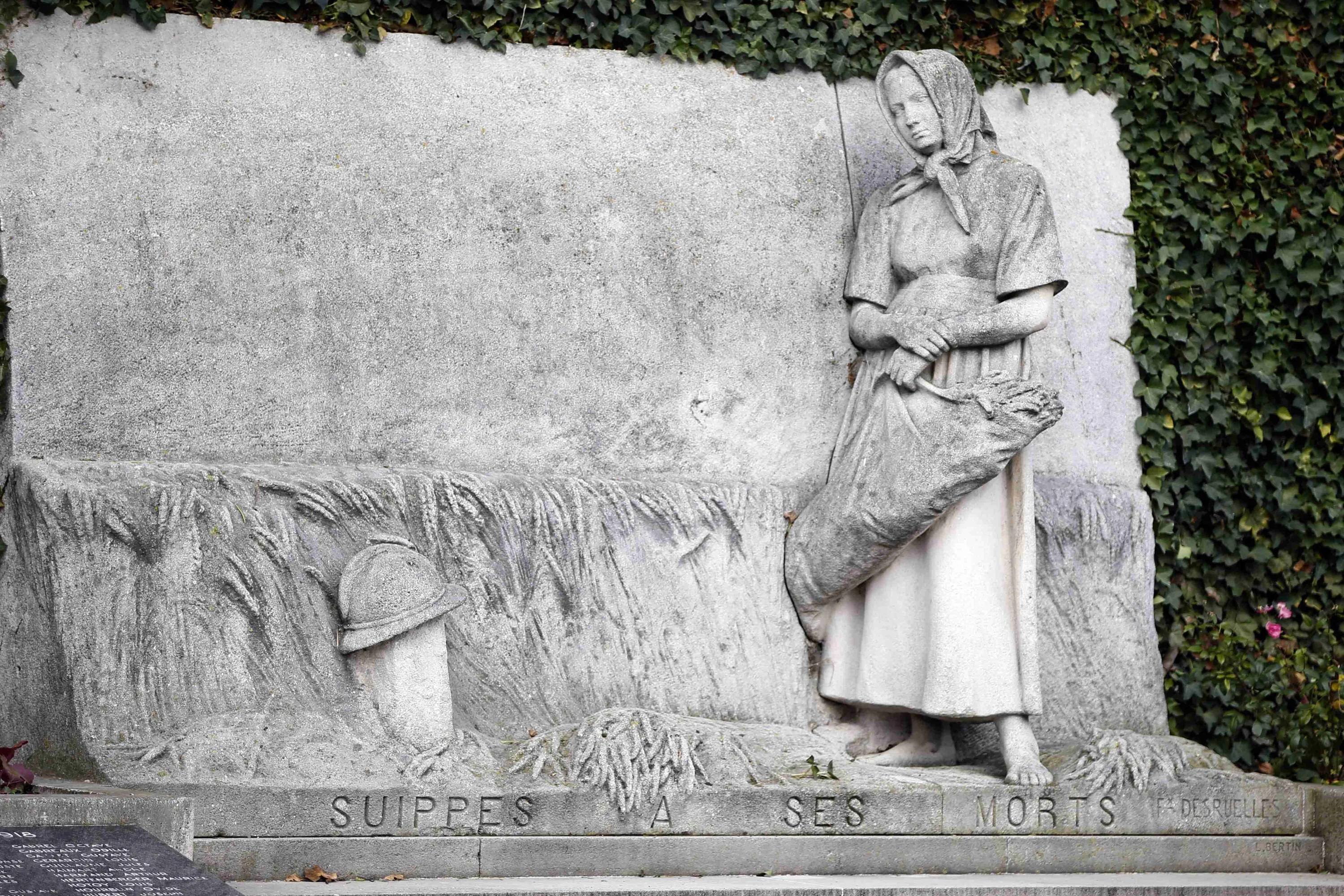 General view of the Suippes war memorial, near Reims, France, November 3, 2015. Sculpted by Felix Desruelles and inaugurated in 1930, it shows a young farmer paying tribute to a French soldier's grave on a battlefield which turns into a grain field. The Camp de Suippes, opened in 1922, is a French Army training area for live artillery firing exercises, and closed to the public. The camp includes five damaged villages, with their churches and cemeteries that are overgrown with vegetation. (Photo by Charles Platiau/Reuters)