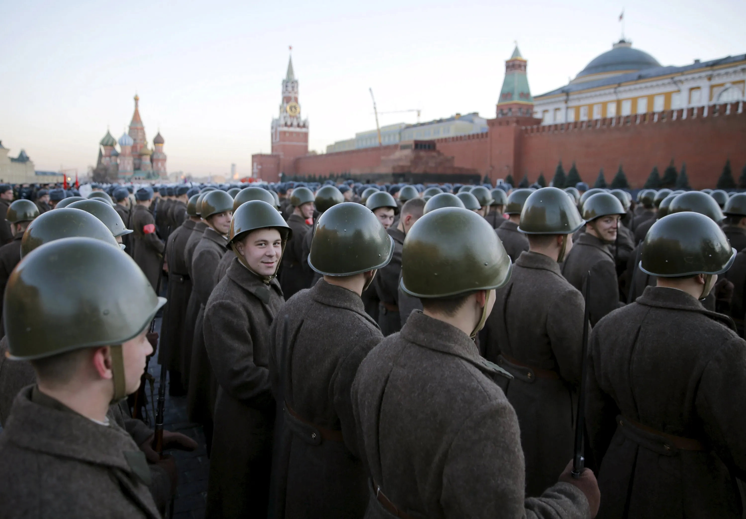 Russian servicemen, dressed in historical uniforms, line up as they take part in a military parade rehearsal in Red Square near the Kremlin in central Moscow, Russia, November 6, 2015. The parade will be held on November 7 to mark the anniversary of a historical parade in 1941 when Soviet soldiers marched through Red Square towards the front lines during World War Two. (Photo by Maxim Shemetov/Reuters)