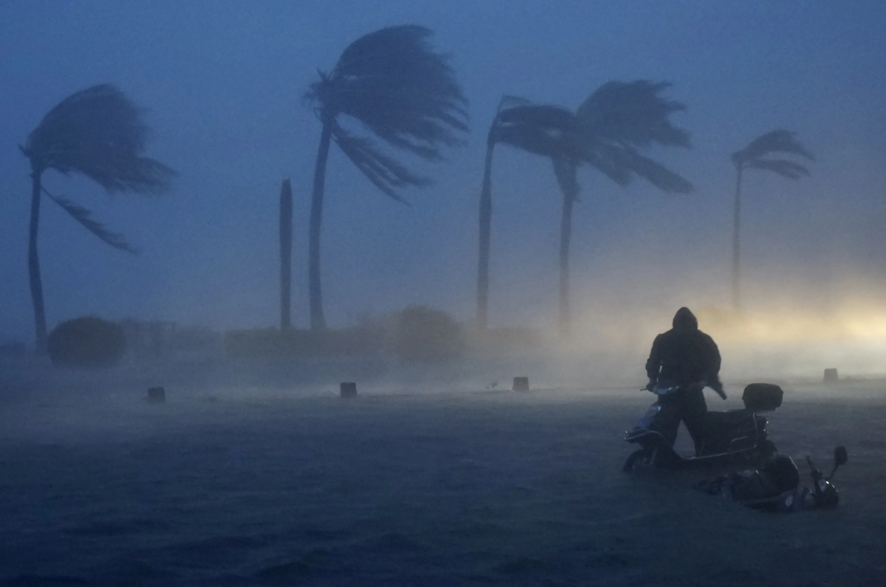 A man pushes his electric bicycle against strong wind and heavy rainfalls along a flooded seaside street as Typhoon Rammasun hits Haikou, Hainan province, China, July 18, 2014. (Photo by Reuters/Stringer)