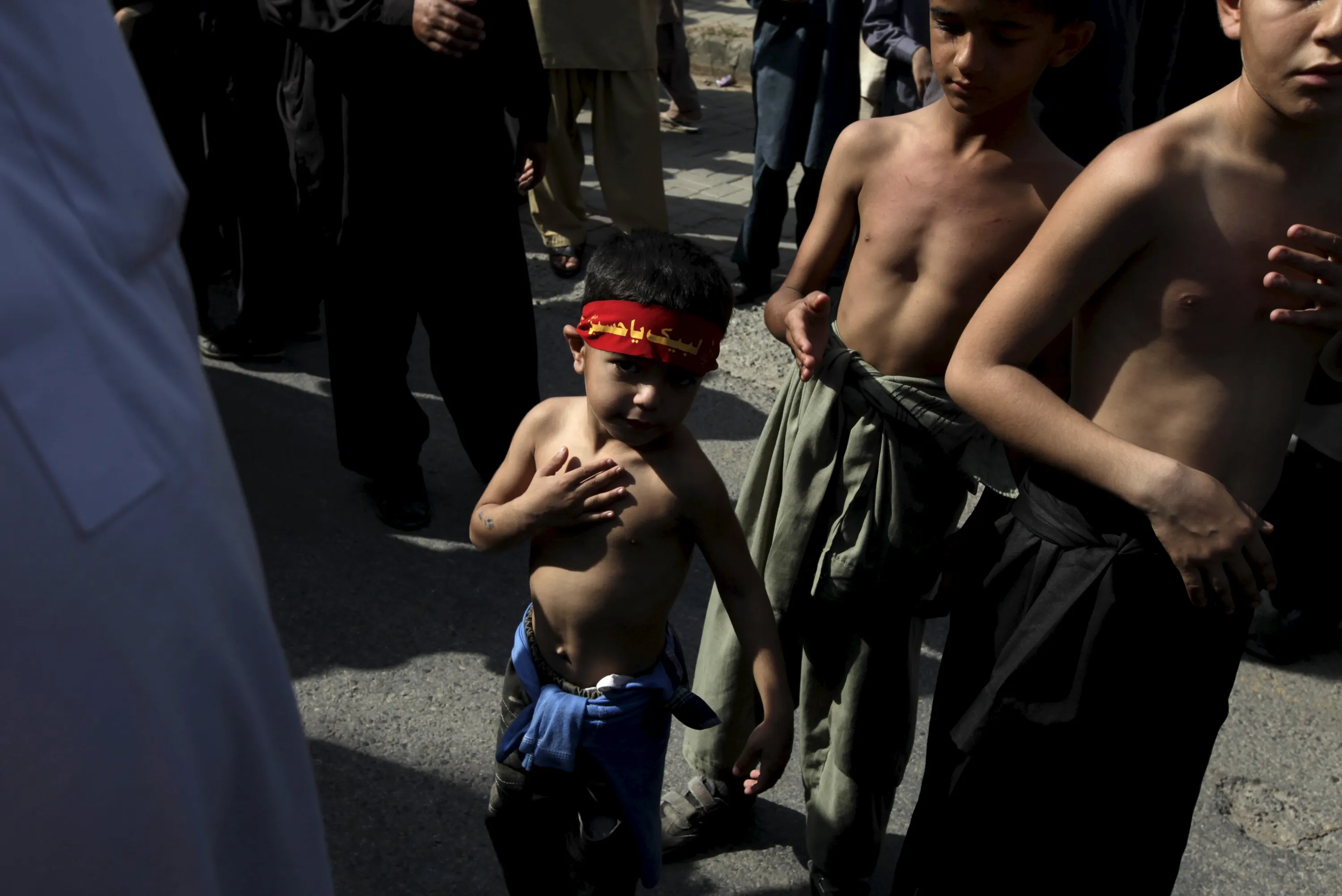 A Pakistani Shi'ite Muslim boy beats his chest while taking part in a Muharram procession with others ahead of Ashura in Islamabad, Pakistan, October 23, 2015. Ashura, which falls on the 10th day of the Islamic month of Muharram, commemorates the death of Imam Hussein, grandson of Prophet Mohammad, who was killed in the seventh century battle of Kerbala. (Photo by Faisal Mahmood/Reuters)