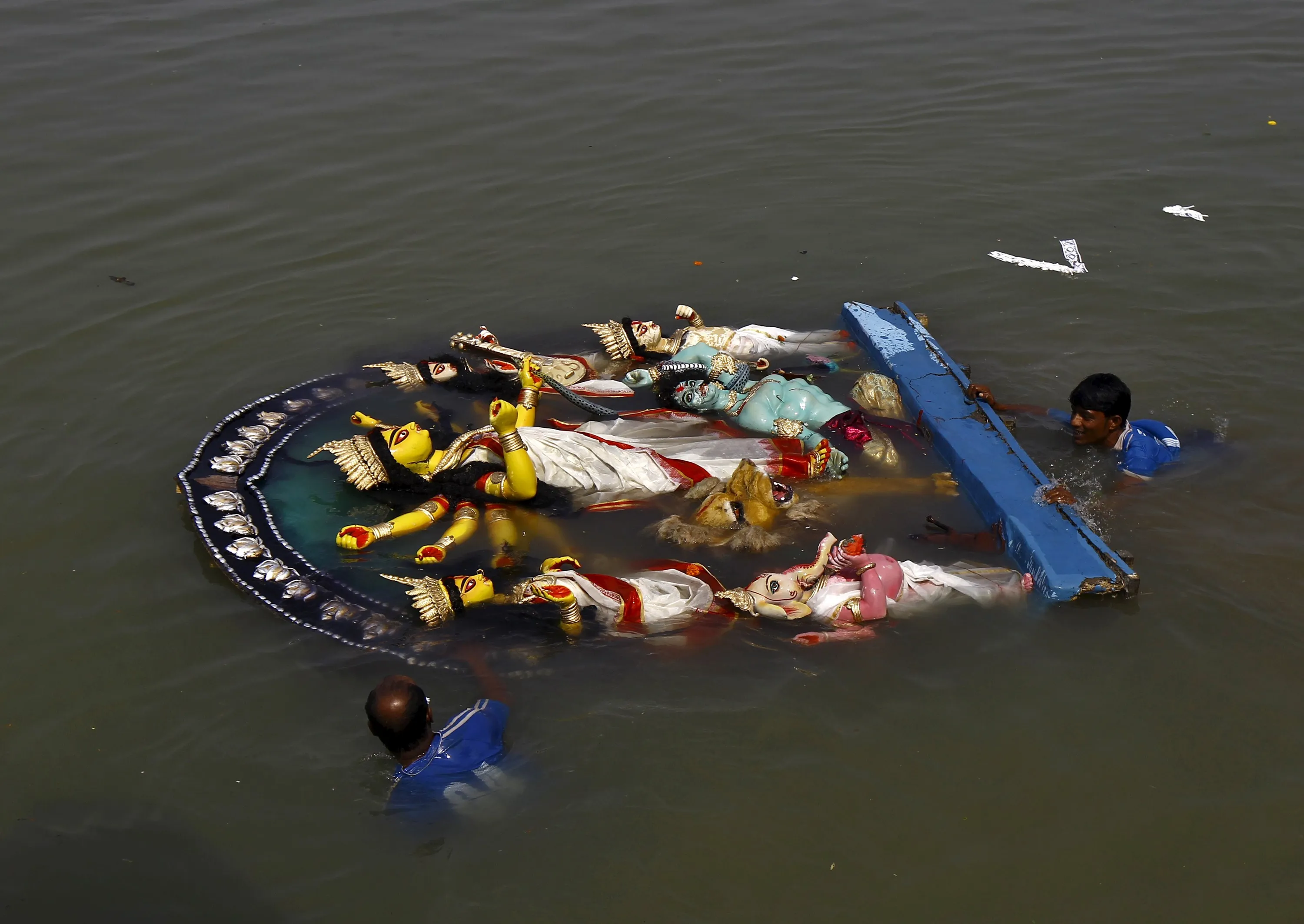 Municipal workers push an idol of the Hindu goddess Durga after it was immersed into the Ganges river after the end of the Durga Puja festival in Kolkata, India, October 25, 2015. (Photo by Rupak De Chowdhuri/Reuters)