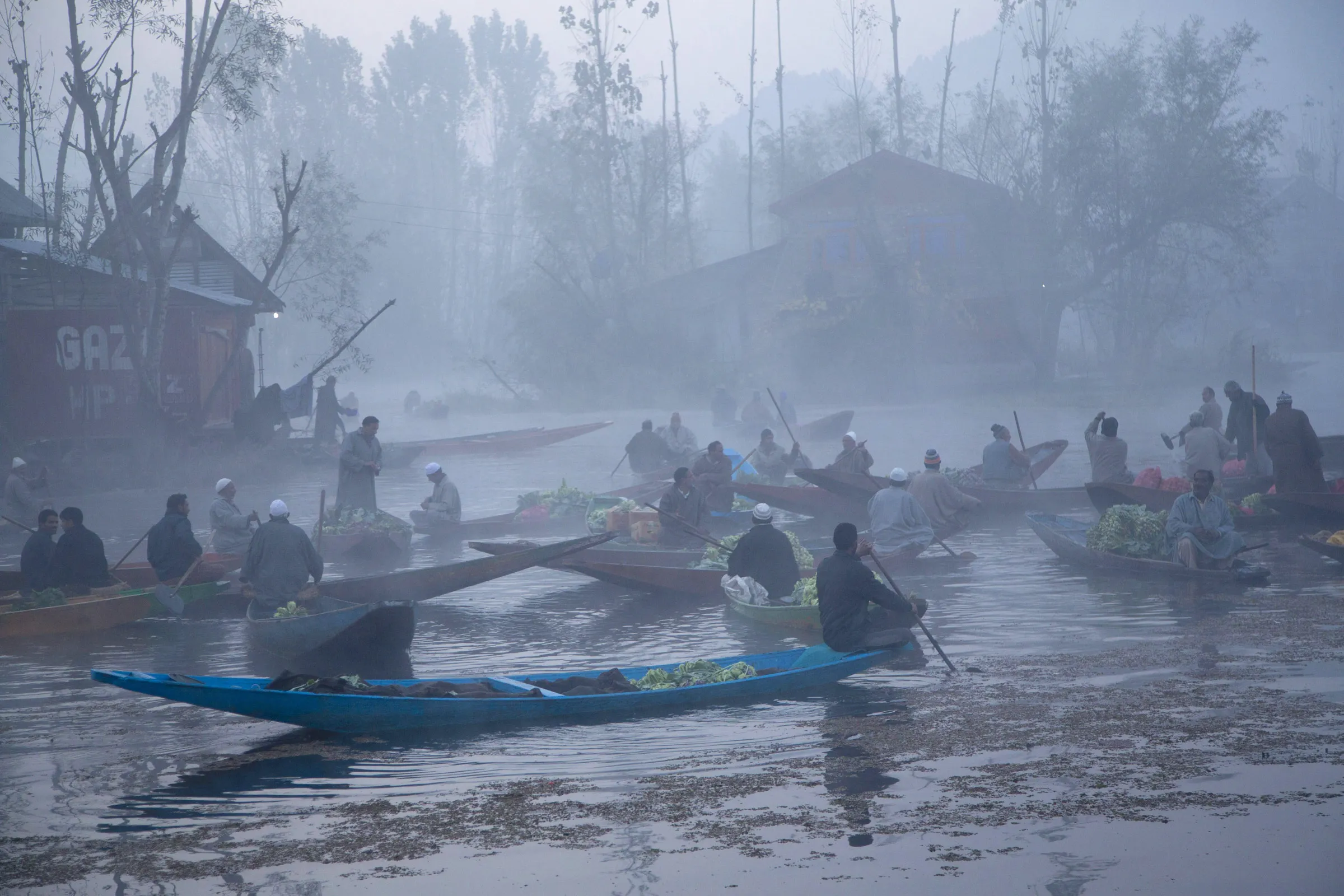 Kashmiri men sell their produce at the floating vegetable market on the Dal Lake surrounded by dense fog on a cold morning in Srinagar, Indian controlled Kashmir, Wednesday, October 28, 2015. Vegetables traded in the floating market are supplied to Srinagar and many towns across the Kashmir valley. It's one of the major sources of income for the lake dwellers who spend years carefully nurturing their floating gardens from the weeds and rich soil extracted from the lake bed. (Photo by Dar Yasin/AP Photo)