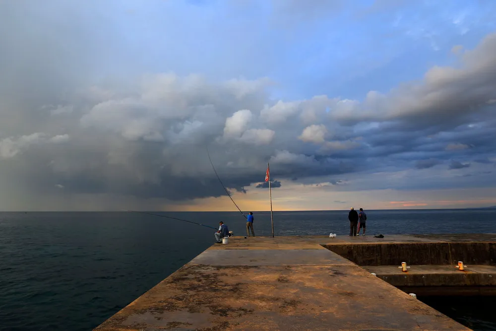 Lebanese fishermen stand on a breakwater along the Beirut coastline as they fish while the sun sets over the Mediterranean Sea in Beirut, Lebanon, Thursday, October 29, 2015. (Photo by Hassan Ammar/AP Photo)