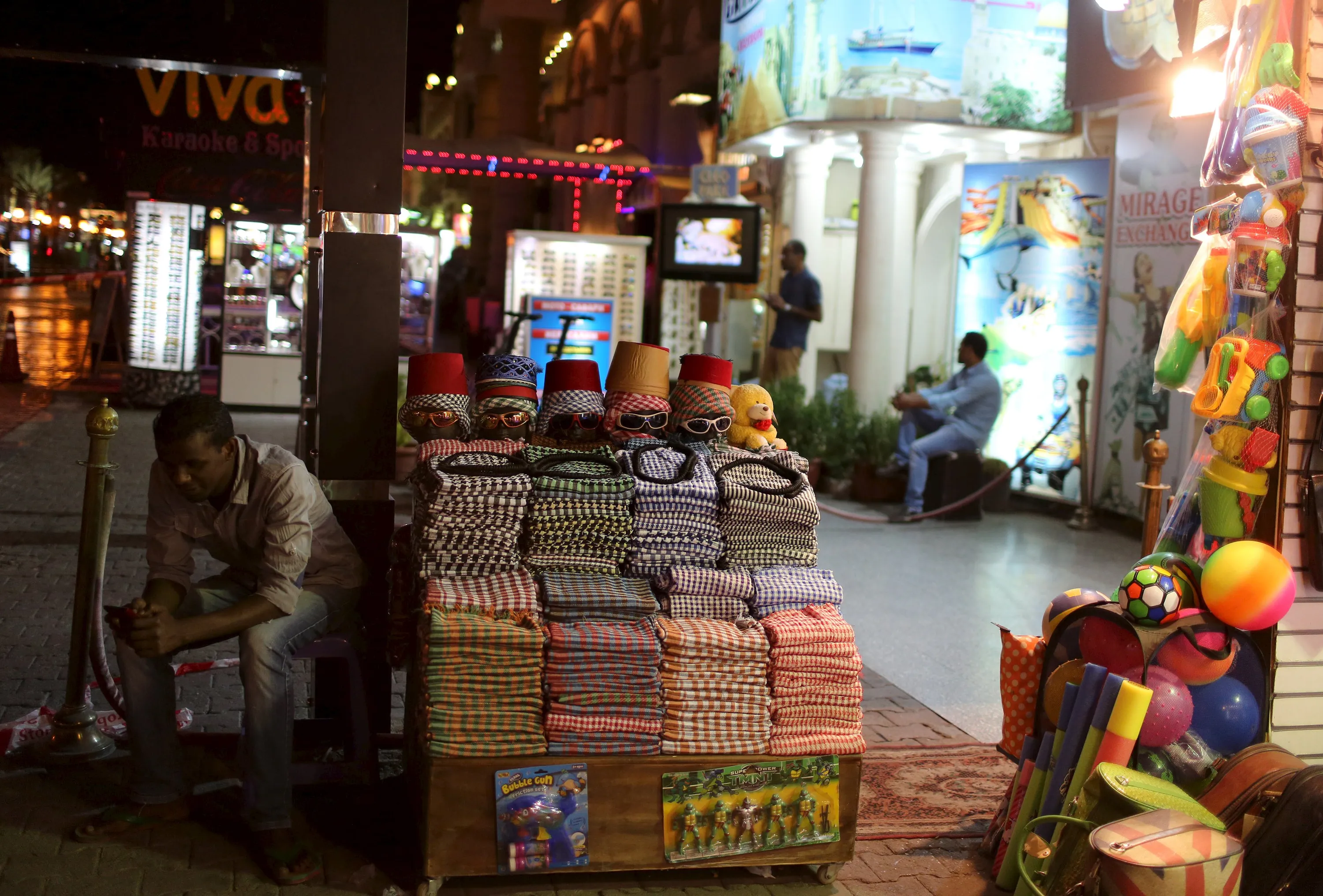 A vendor (front) and employees for excursion trips wait for customers in Naama bay area at the Red Sea resort of Sharm el-Sheikh, November 8, 2015. (Photo by Asmaa Waguih/Reuters)