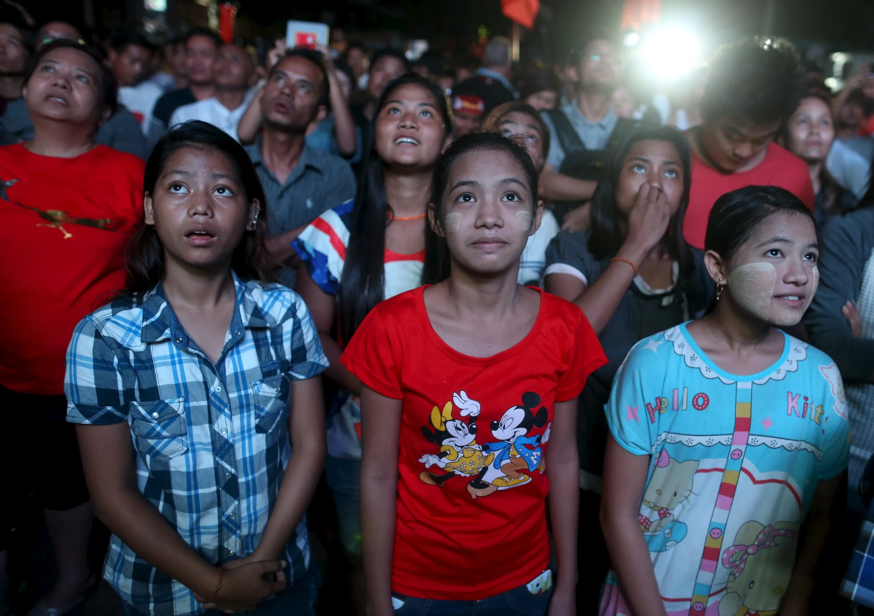 Supporters of Myanmar opposition leader Aung San Suu Kyi celebrate partial results shown on television outside NLD party headquarters in Yangon November 8, 2015. Voting unfolded smoothly in Myanmar on Sunday with no reports of violence to puncture a mood of jubilation marking the Southeast Asian nation's first free nationwide election in 25 years, its biggest stride yet in a journey to democracy from dictatorship. (Photo by Soe Zeya Tun/Reuters)