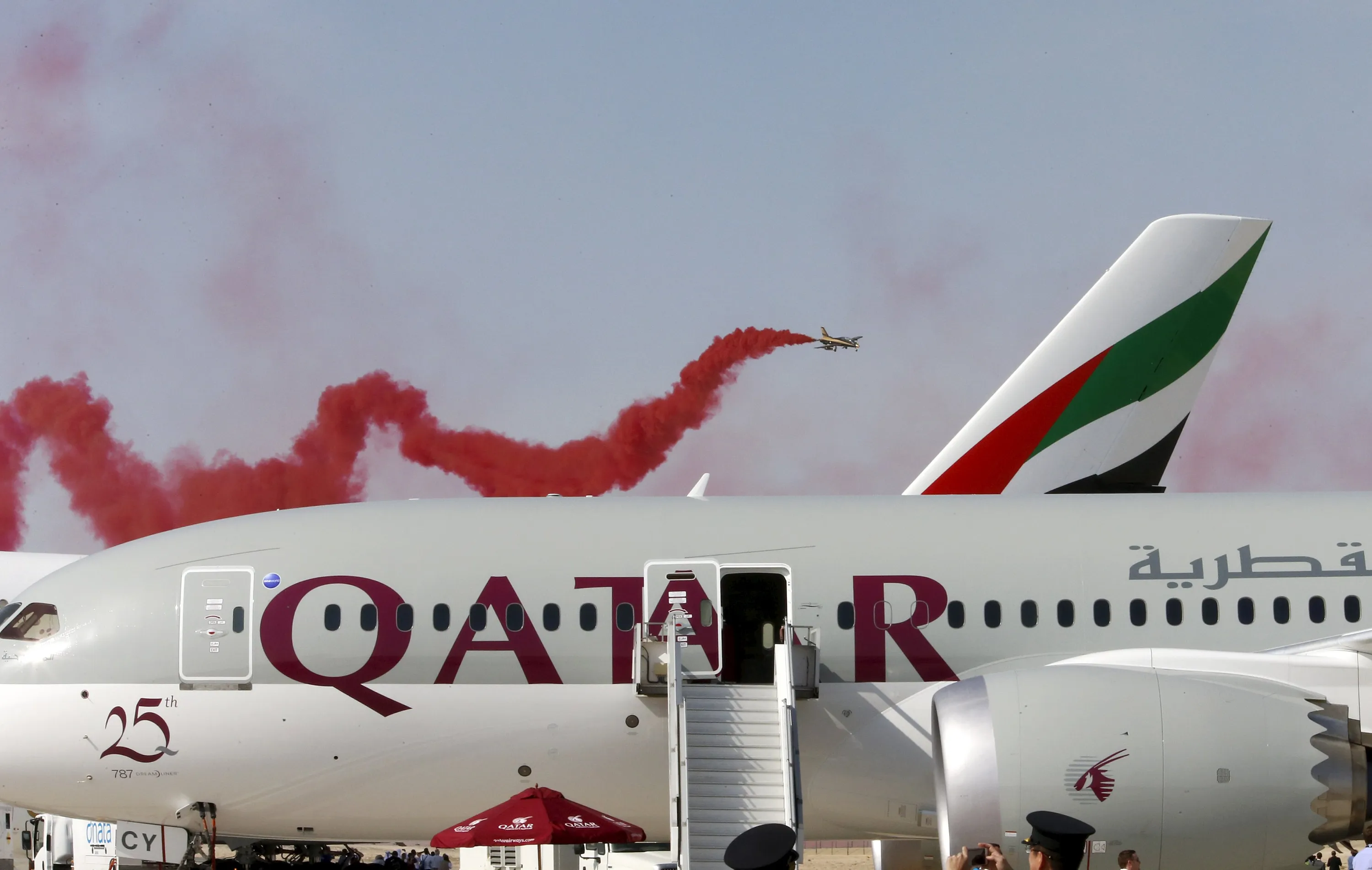 A performance by Al Fursan, the aerobatics demonstration team of the UAE Air Force, is seen behind a Qatar Airways plane at the Dubai Airshow November 8, 2015. (Photo by Ahmed Jadallah/Reuters)