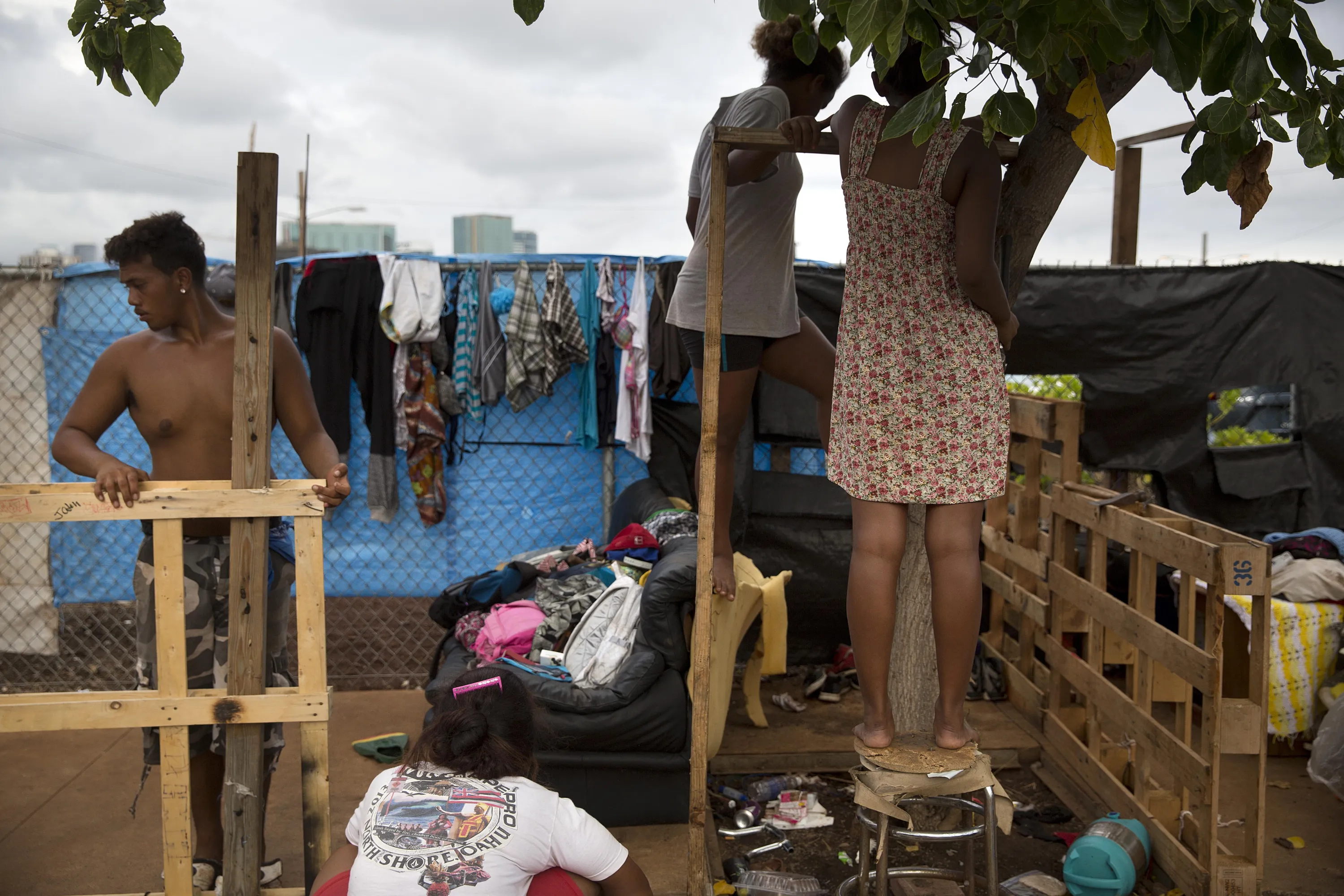 In this Monday, August 24, 2015 photo, 18-year-old Roy Kalama, left, gets help from friends as he tries to build a makeshift tent using pallets at a homeless encampment in the Kakaako district of Honolulu. The camp, one of the nation's largest homeless encampment and once home to hundreds of people, was recently cleared by Hawaii officials. (Photo by Jae C. Hong/AP Photo)
