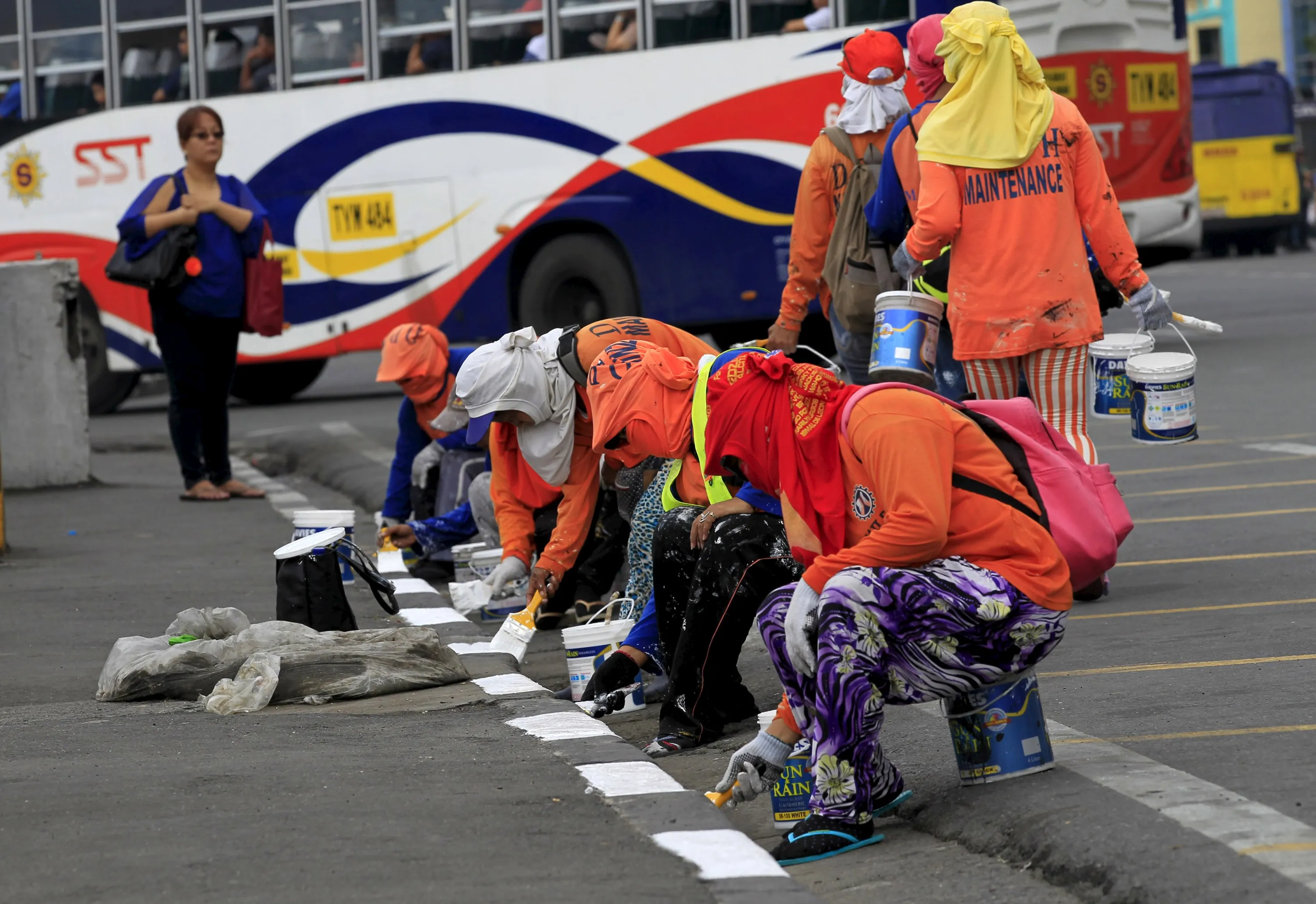 Government workers re-paint the sidewalks of a main street at Roxas boulevard, metro Manila, November 9, 2015, as part of a clean-up project in preparation for the upcoming Asia-Pacific Economic Cooperation (APEC) summit meeting in Manila on November 18-19. (Photo by Romeo Ranoco/Reuters)