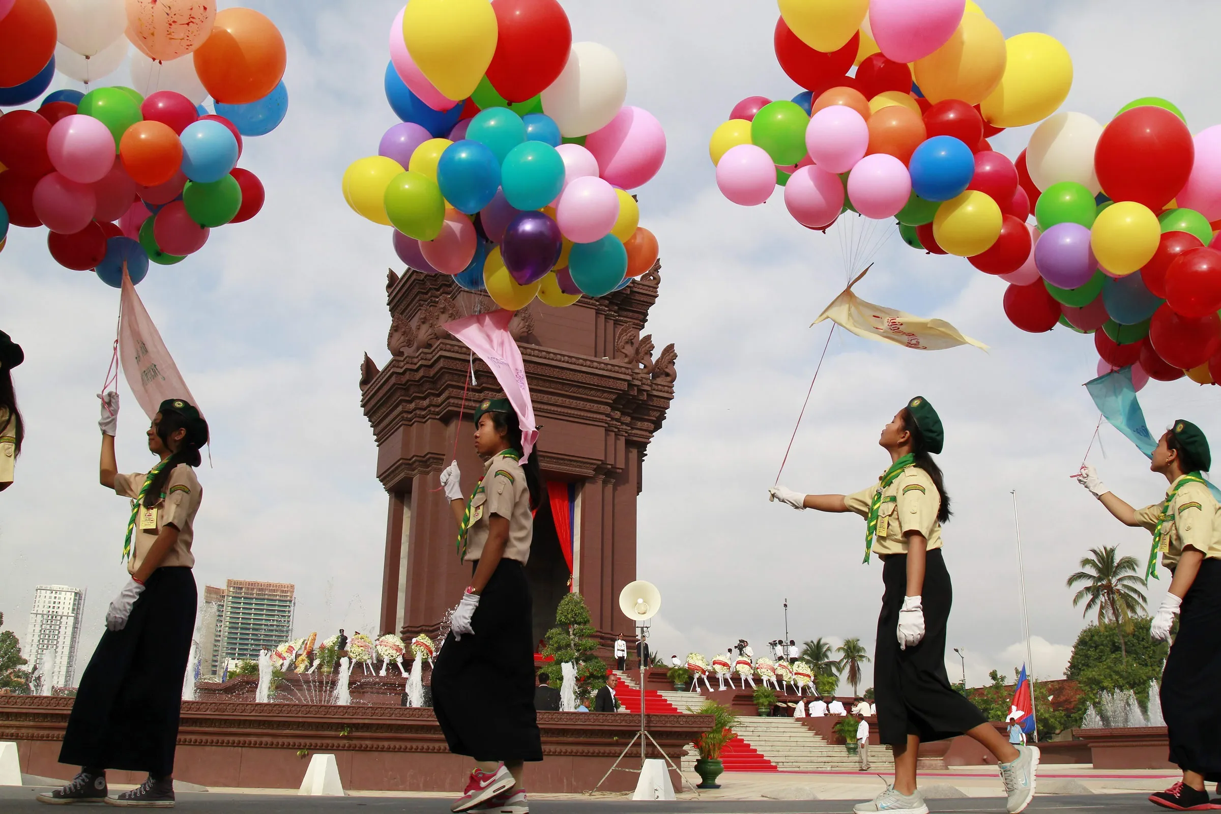 Cambodian students hold balloons during a ceremony at the Independence Monument in Phnom Penh, Cambodia, 09 November 2015. Cambodia is marking its 62nd anniversary of independence from France. (Photo by Mak Remissa/EPA)