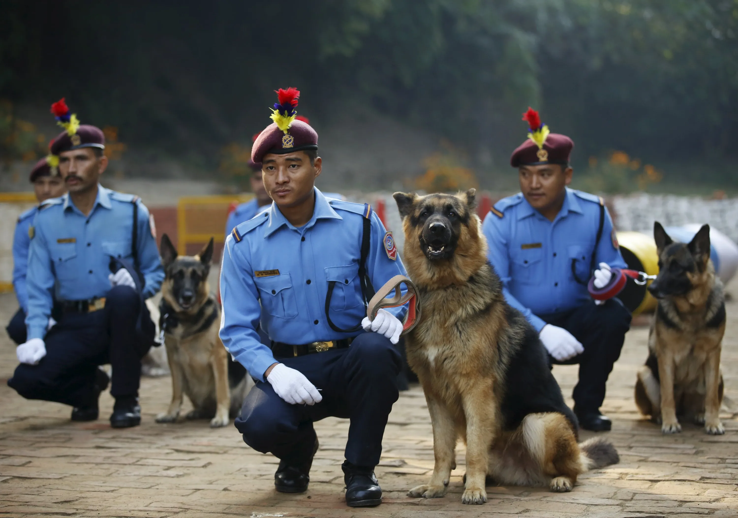 Nepalese police officers squat next to their dogs during the dog festival as part of celebrations of Tihar at Central Police Dog Training School in Kathmandu, Nepal November 10, 2015. (Photo by Navesh Chitrakar/Reuters)