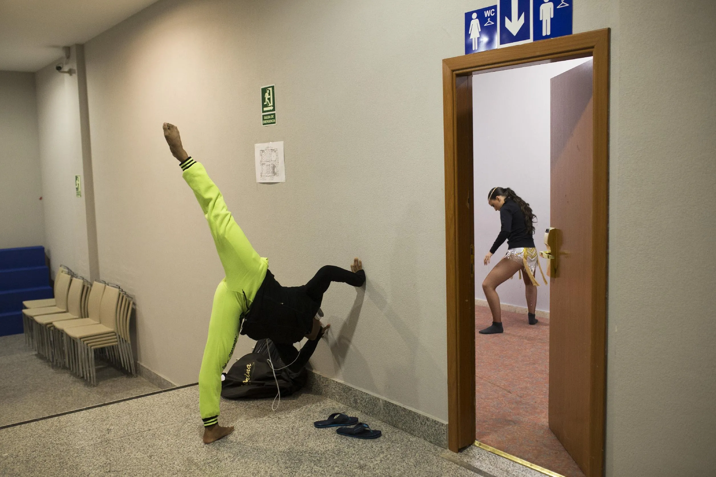 In this Friday, November 6, 2015 photo Venezuelan dancer Yeifren Mata, left, and Spanish Julia Fernandez stretch backstage before taking part in the World Salsa Master dance competition in Madrid. (Photo by Francisco Seco/AP Photo)