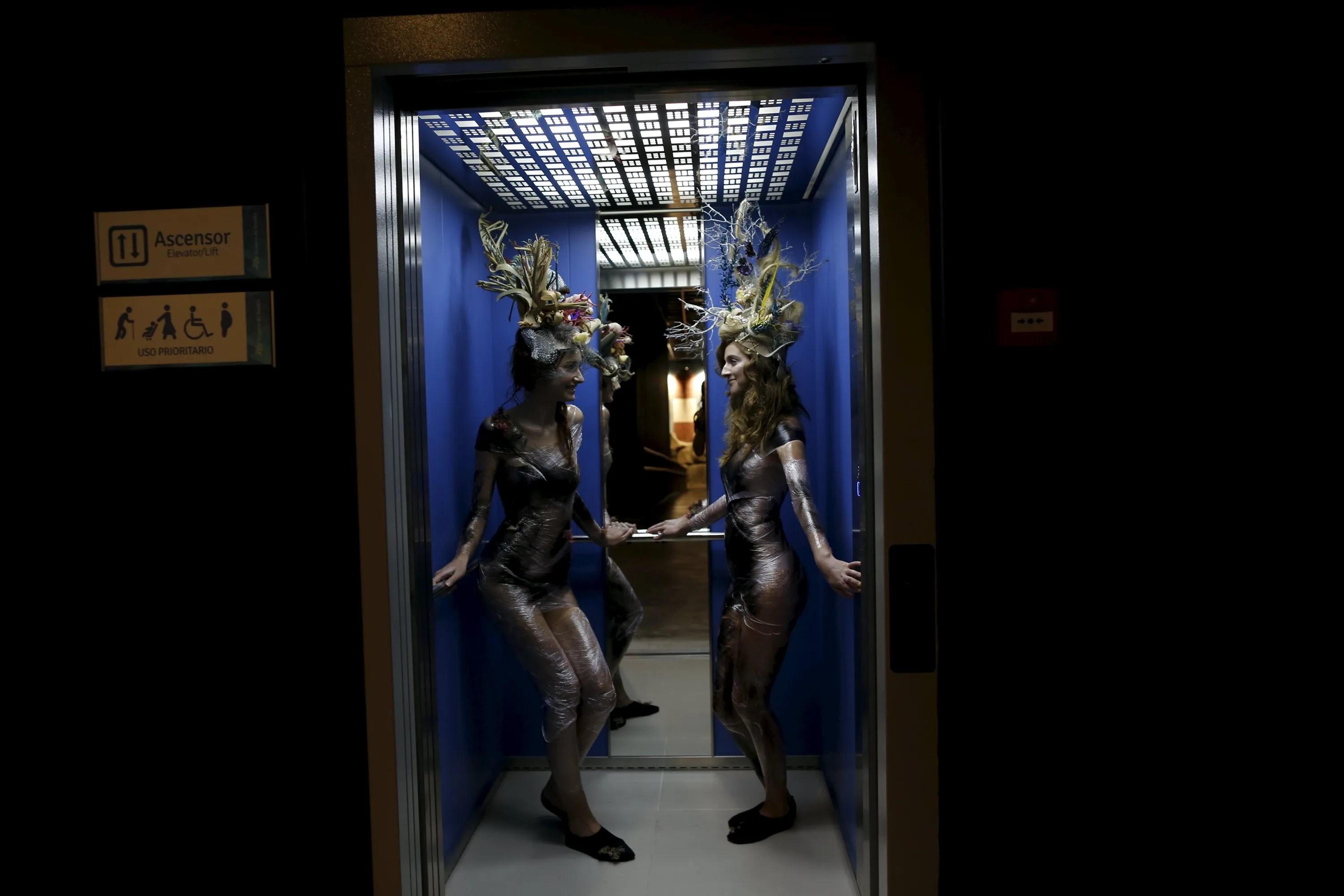 Models wearing creations by Luis Benitez are seen in an elevator during an urban shoot as part of Andalucia de Moda (Andalusia Fashion) at the aquarium of Seville, southern Spain, November 11, 2015. (Photo by Marcelo del Pozo/Reuters)