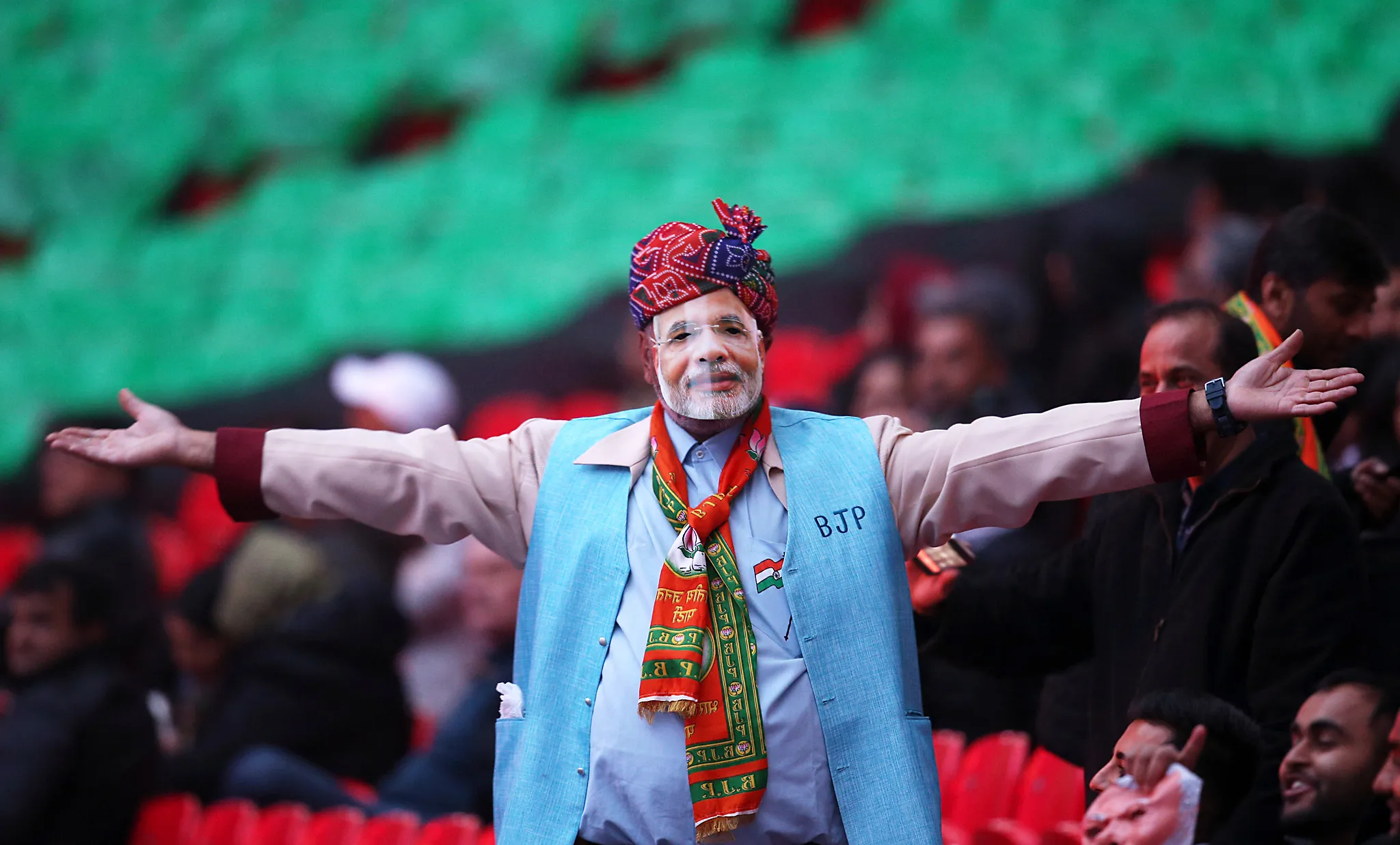 A man wearing a mask depicting Narendra Modi waves at Wembley Stadium prior to the Indian Prime Minister speaking, during the second day of an official three day visit on November 13, 2015 in London, England. Around 60,000 people including British Indians from 450 different community groups from around the country are expected to fill the stadium. A concert by an arts programme featuring 800 performers, including the Indian singing star Kanika Kapoor and the London Philharmonic Orchestra will entertain the crowd. Following Modi's address will be what is billed as one of the UKs largest ever firework displays. (Photo by Dan Kitwood/Getty Images)