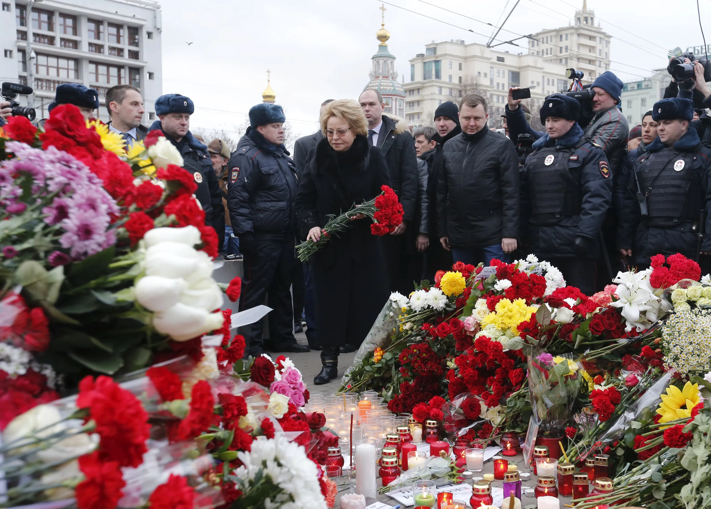 Federation Council Speaker Valentina Matviyenko (C) puts flowers near the French embassy to commemorate victims of the Paris attacks, in Moscow, Russia, November 14, 2015. (Photo by Maxim Zmeyev/Reuters)