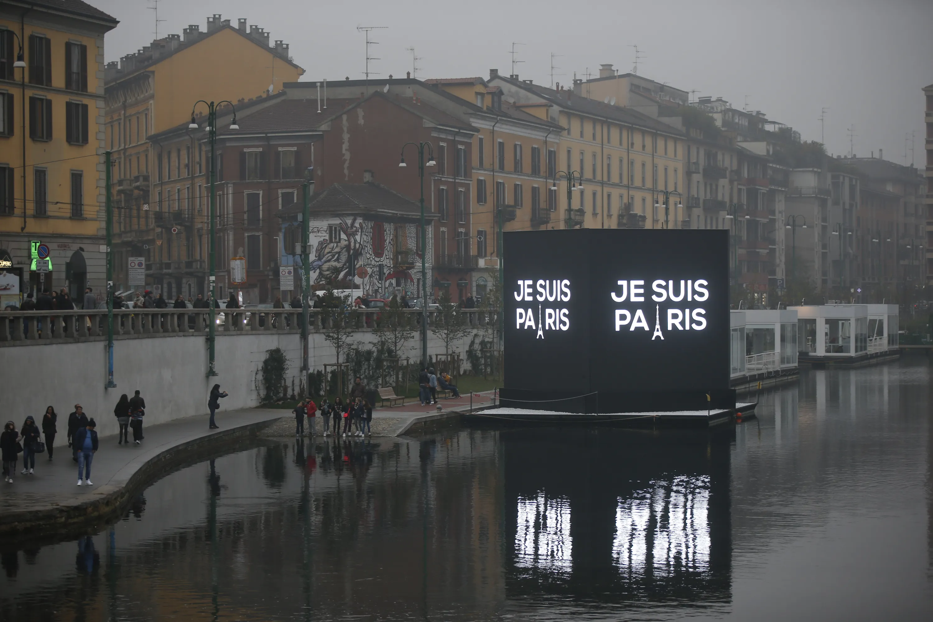 An electronic billboard on a canal in Milan, Italy, reads in French "I'm Paris", Saturday, November 14, 2015. French police on Saturday hunted possible accomplices of eight assailants who terrorized Paris concert-goers, cafe diners and soccer fans with a coordinated string of suicide bombings and shootings in France's deadliest peacetime attacks. (Photo by Luca Bruno/AP Photo)