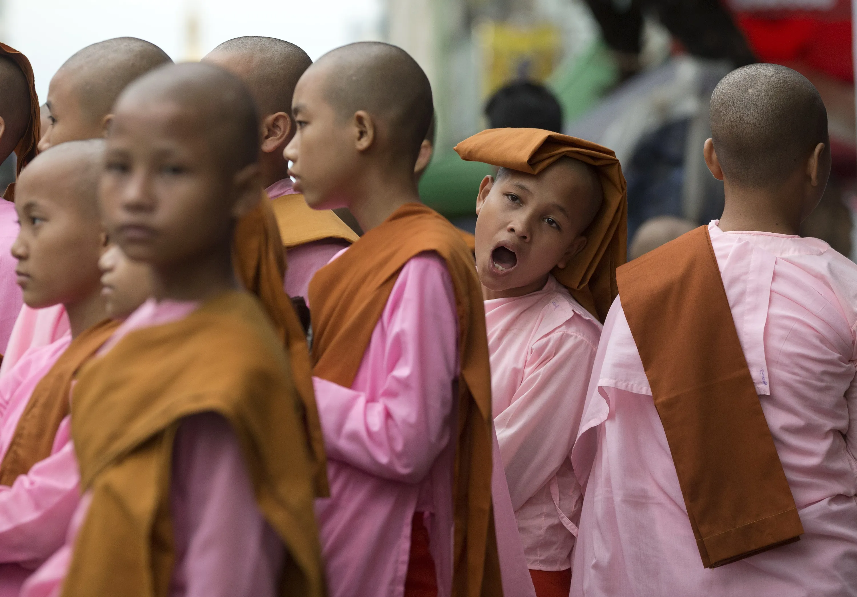 Novice Buddhist nuns line up after walking the streets to collect alms in central Yangon, Myanmar, Tuesday, November 10, 2015. (Photo by Mark Baker/AP Photo)