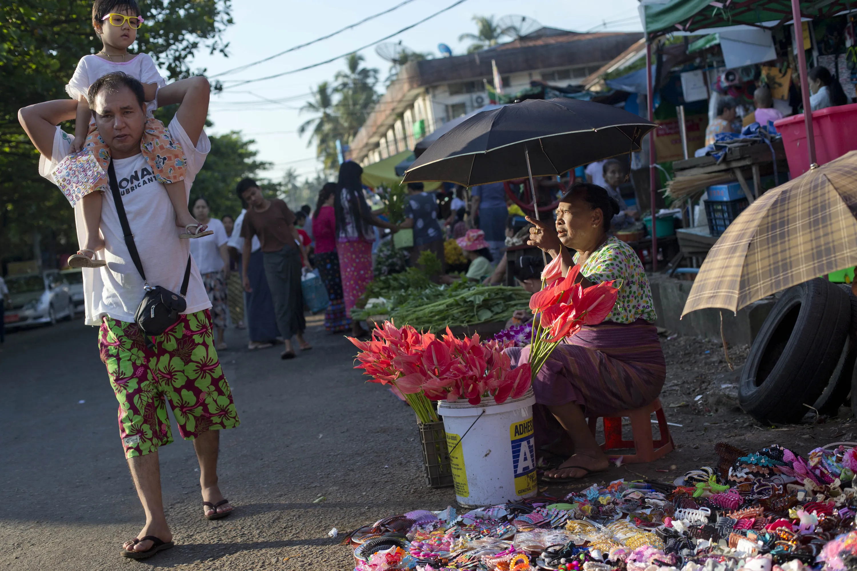 A man carries a child as a flower vendor watches in Yangon, Myanmar, Saturday, November 7, 2015. (Photo by Gemunu Amarasinghe/AP Photo)