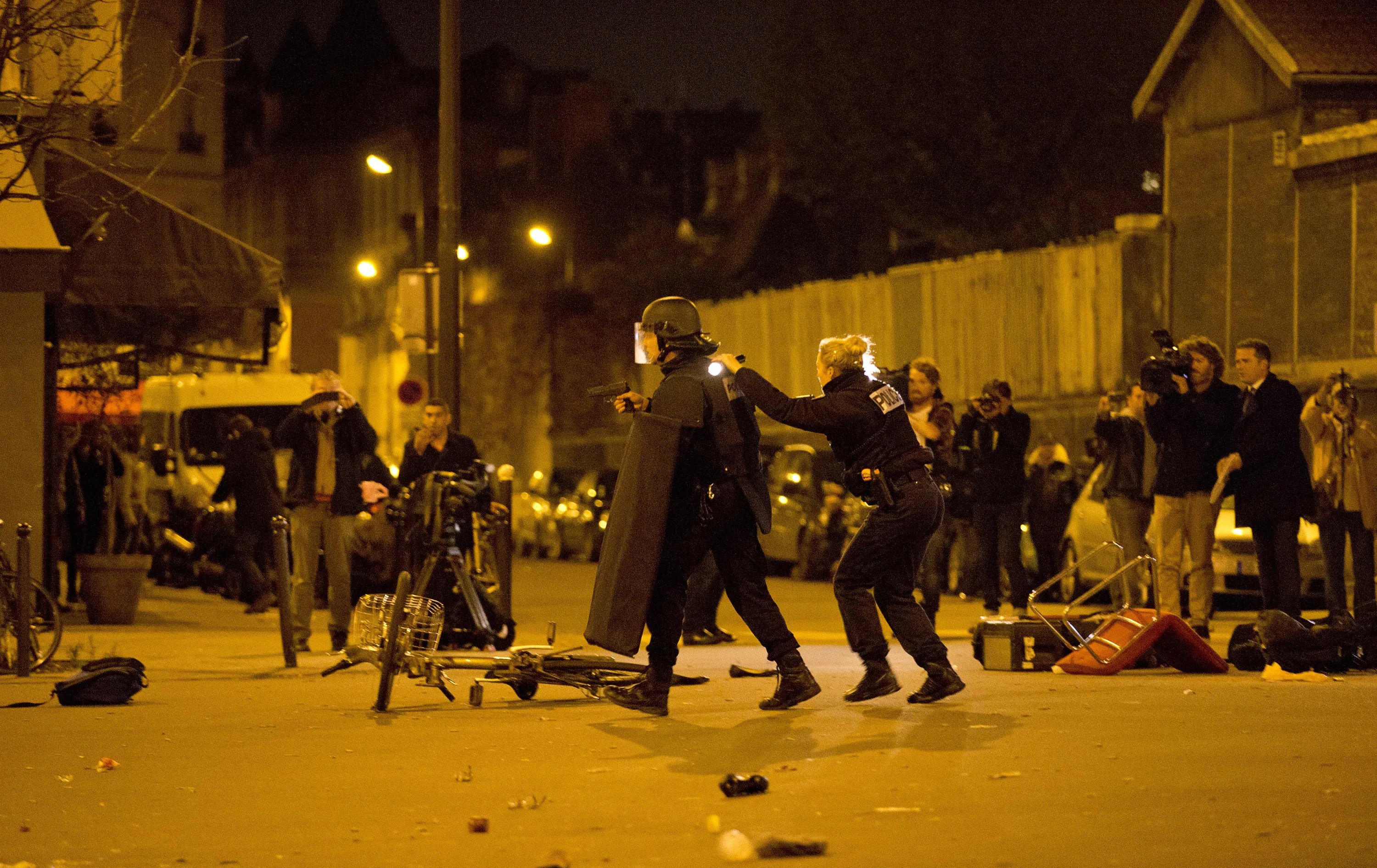French police secure the perimeter after panic broke out among mourners who payed their respect at the attack sites at restaurant Le Petit Cambodge (Little Cambodia) and the Carillon Hotel in Paris, Sunday, November 15, 2015. (Photo by Peter Dejong/AP Photo)