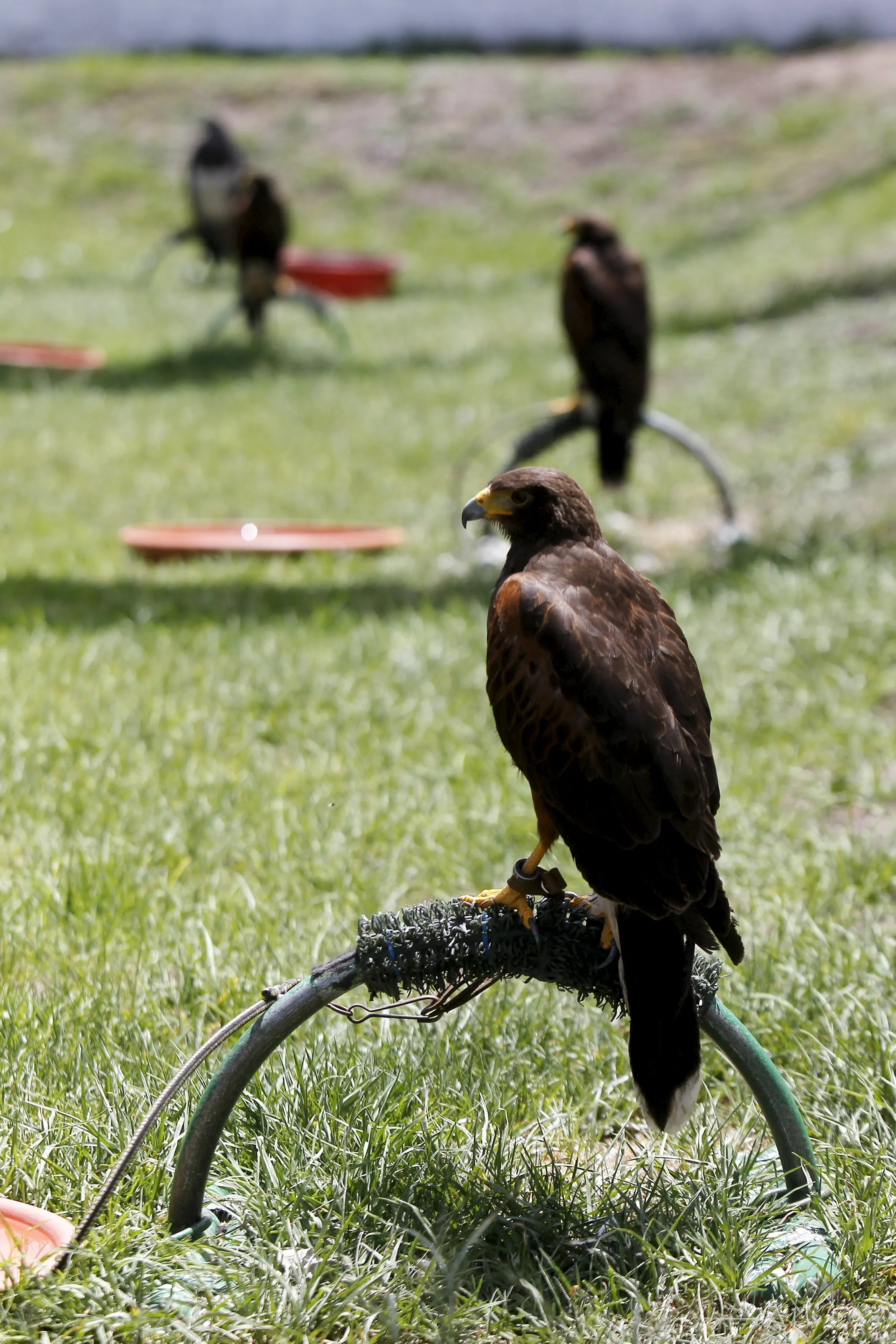 Harris hawks rest on their perches at the Mariscal Sucre Airport in Quito, Ecuador November 14, 2015. They are used to control fauna to avoid bird strikes during takeoffs and landings. (Photo by Guillermo Granja/Reuters)