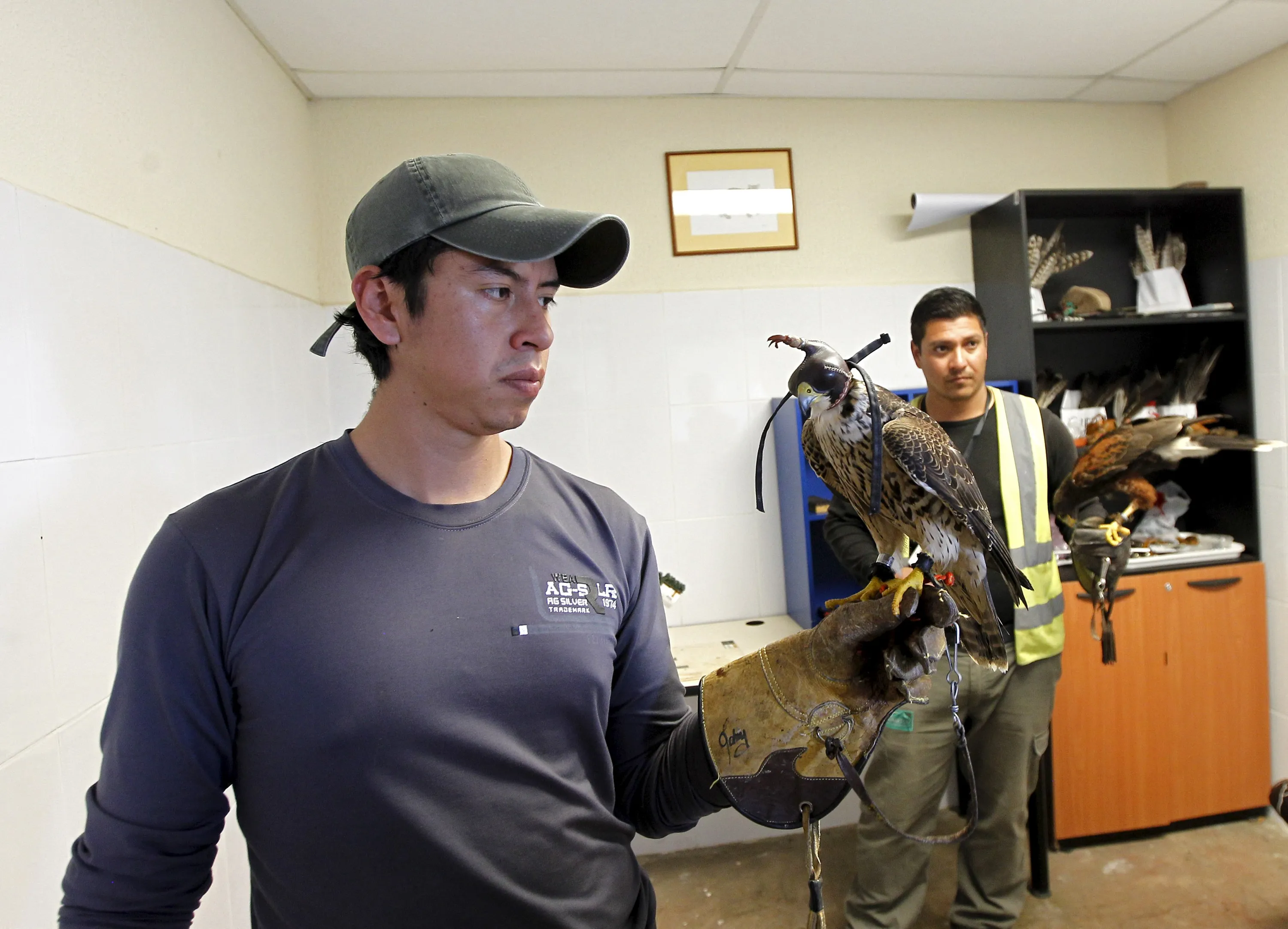 Handler Jhonny Sanchez holds a Peregrin Falcon as handler Xavier Monar holds a Harris Hawk at the Mariscal Sucre Airport in Quito November 14, 2015. (Photo by Guillermo Granja/Reuters)