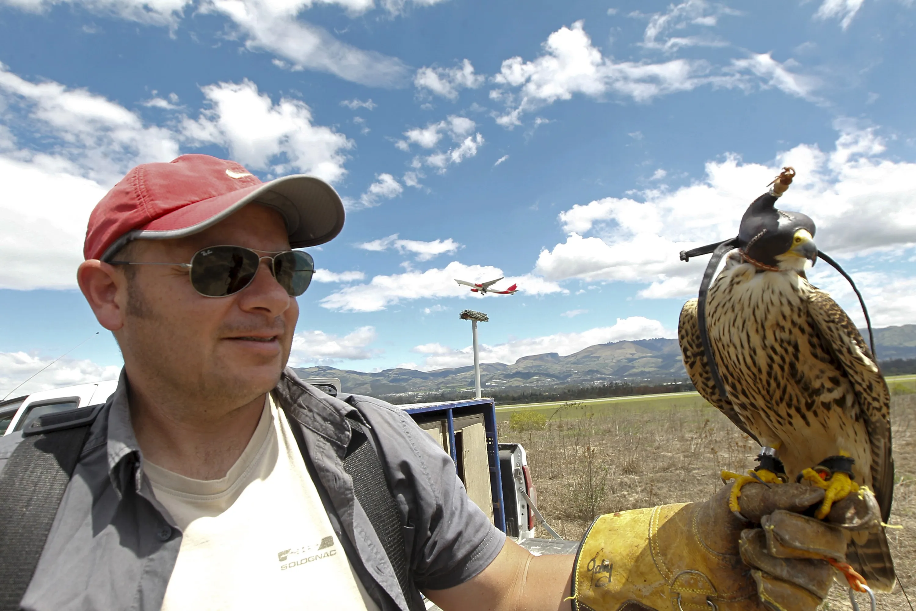 Handler Paul Tufino, 47, holds a Peregrin Falcon as an aircraft takes off in the background, at the Mariscal Sucre Airport in Quito November 14, 2015. (Photo by Guillermo Granja/Reuters)