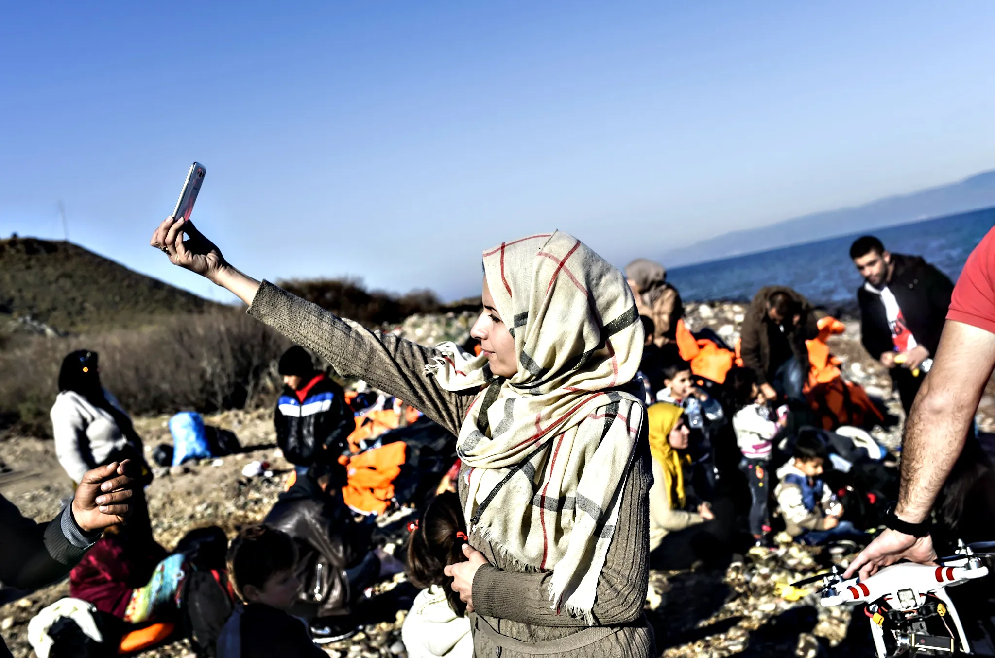 A woman takes a selfie after arriving, along with other migrants and refugees, on the Greek island of Lesbos by crossing the Aegean Sea from Turkey on November 13, 2015. EU leaders on November 12 struck an aid-for-cooperation deal with Africa and proposed a summit this year with Turkey in a two-front push with wary partners to tackle an unprecedented migrant crisis. (Photo by Bulent Kilic/AFP Photo)