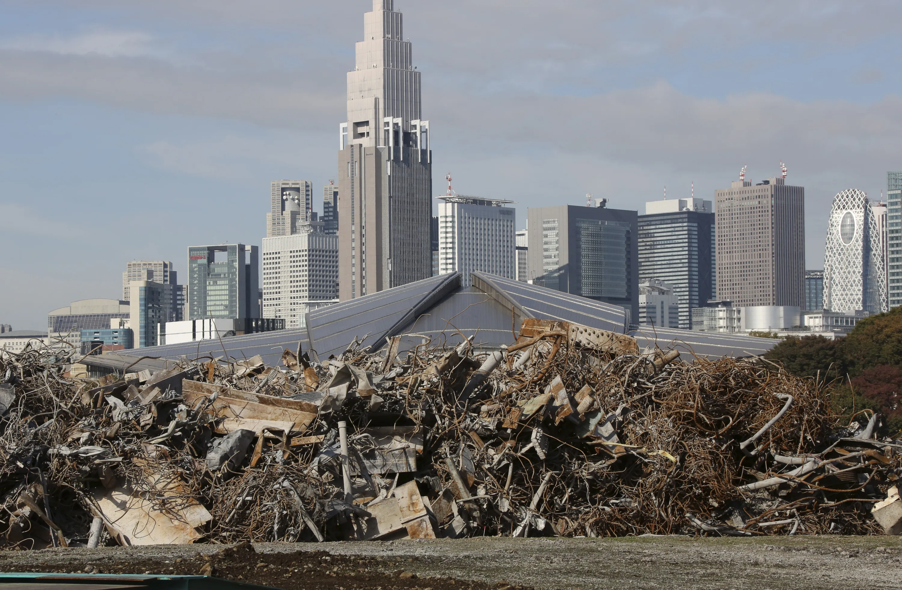 Skyscrapers soar above the roof of the Tokyo Metropolitan Gymnasium as the rubble of Japan's National Stadium demolished for the renovation for the 2020 Olympic games is collected at one corner of the vacant site shown to the media for the first time after the completion of the demolition work in Tokyo Monday, Nov. 16, 2015. Japan's Prime Minister Shinzo Abe scrapped the original plan for a new stadium to replace one used for the 1964 Tokyo Olympics in July, saying it was too costly. The design by Iraqi-British architect Zaha Hadid raised protests from many in Tokyo who objected to its massive size, cost and ultra-modern shape. The selection of a new stadium design is due by the end of this year. (Photo by Koji Sasahara/AP Photo)