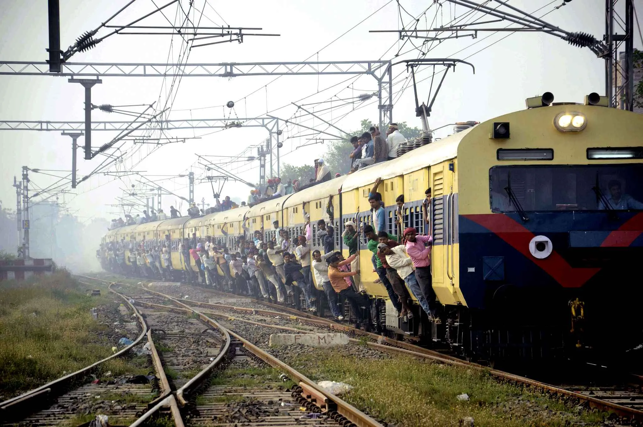 Indian passengers hang from the doors of the coaches of an over crowded train to travel home for the Chhath Puja festival dedicated to the Sun God, at Parsa Bazar railway station in Patna, Bihar state, India, Monday, November 16, 2015. People travel home from Bihar in large numbers for Chhath, one of the most significant festival for people in the region. (Photo by Aftab Alam Siddiqui/AP Photo)