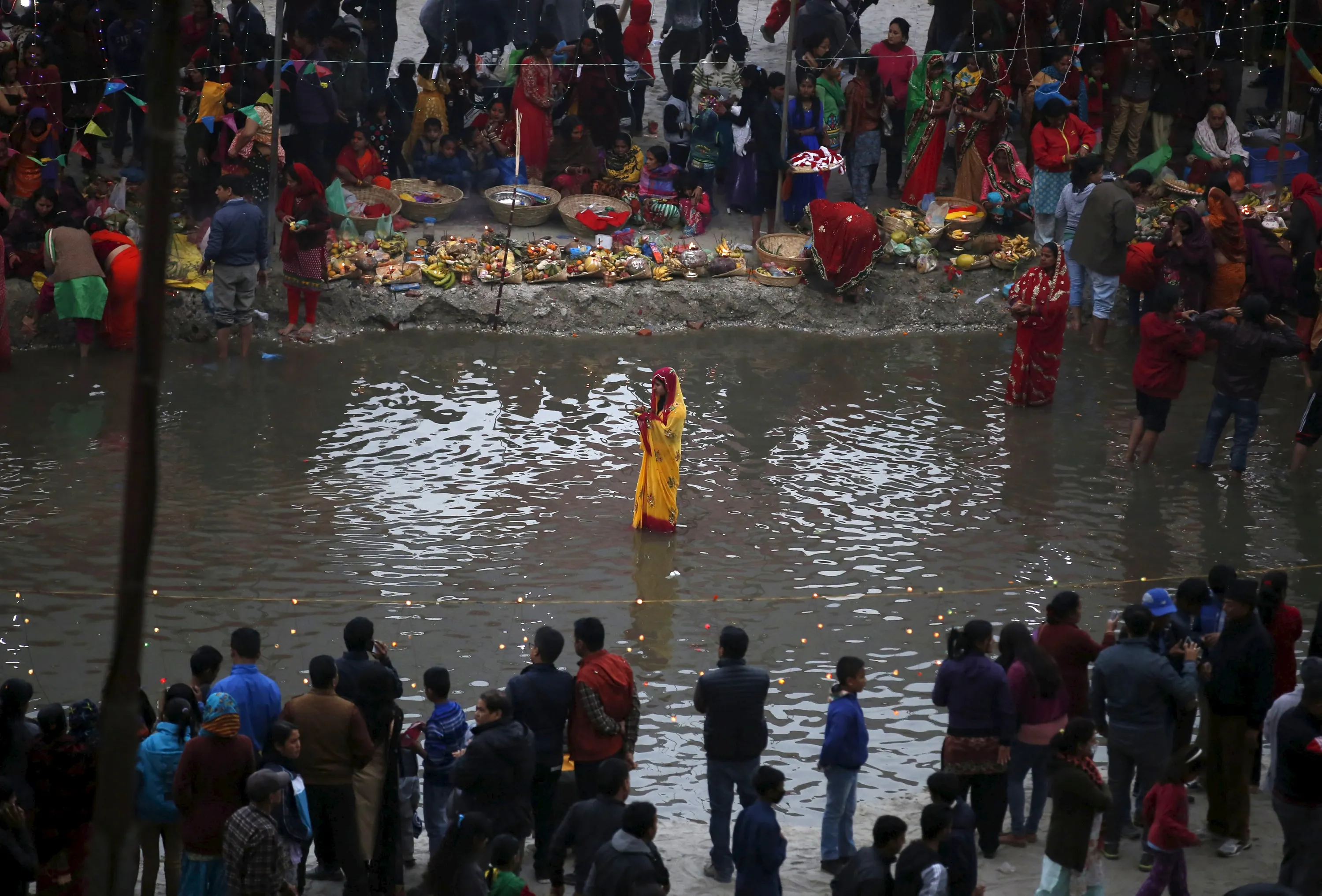 A devotee (C) offers prayers to the setting sun as people gather during the "Chhat" festival at Bagmati River in Kathmandu, Nepal November 17, 2015. (Photo by Navesh Chitrakar/Reuters)