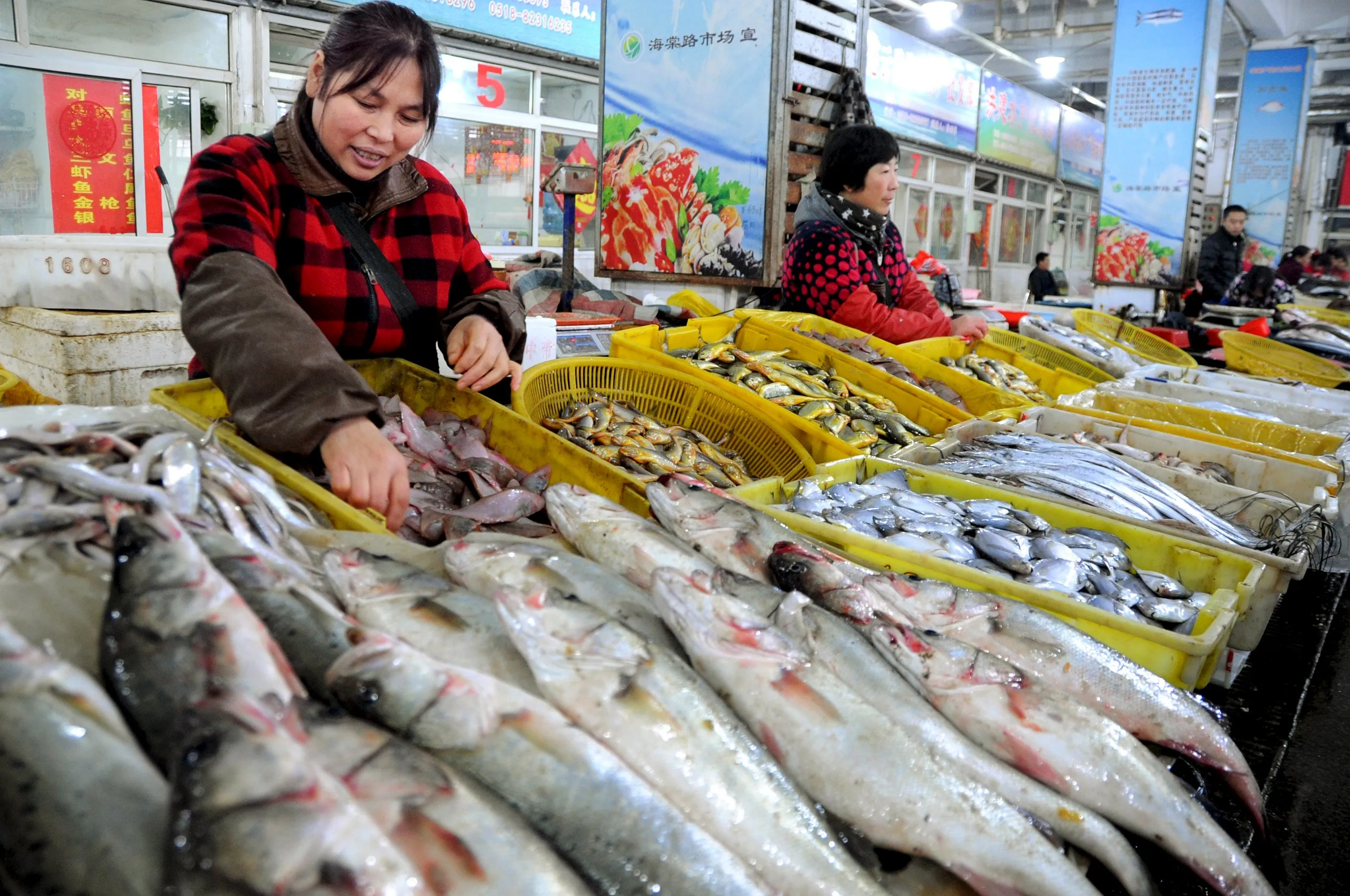 Seafood vendors wait for customers at a market in Lianyungang, Jiangsu province, China November 10, 2015. China's October inflation data showed persisting if not intensifying deflationary pressure, spurring analysts to expect more moves to stimulate the slowing economy by year-end. (Photo by Reuters/China Daily)