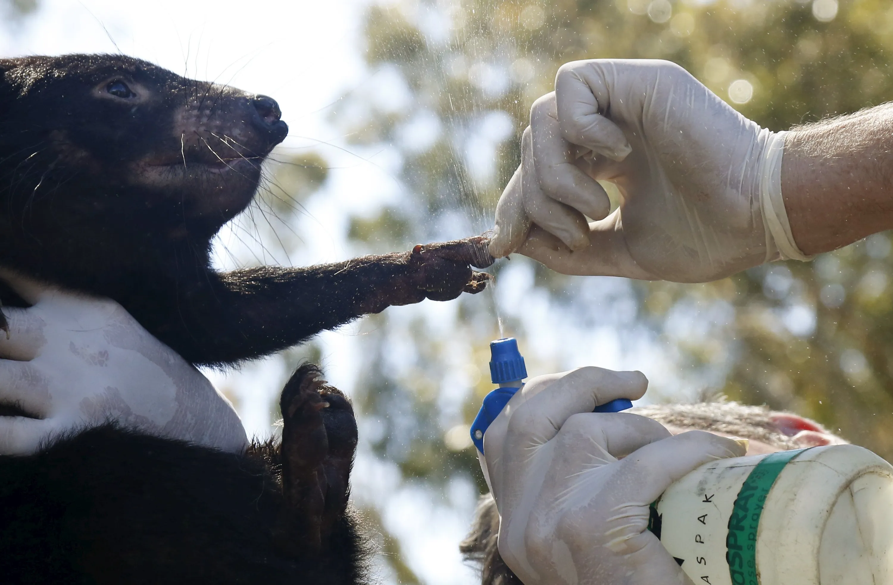 A Tasmanian Devil named Irene has her paws sprayed with disinfectant by operations manager Mike Drinkwater as she is prepared as part of a shipment of healthy and genetically diverse devils to the island state of Tasmania, from the Devil Ark sanctuary in Barrington Tops on Australia's mainland, November 17, 2015. (Photo by Jason Reed/Reuters)