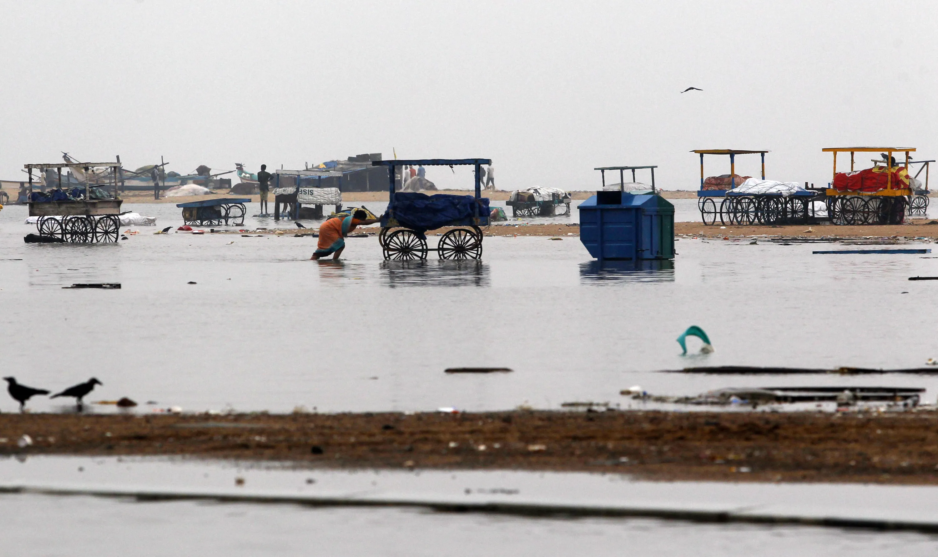 An Indian woman pushes a cart on the waterlogged Marina Beach after heavy rainfall in Chennai, India, Friday, November 13, 2015. Heavy rains lashed Chennai and other parts of Tamil Nadu state Friday, throwing life out of gear and disrupting train and flight schedules even as dozens were killed in rain related incidents, according to news reports. The Indian Meteorological Department has warned of more rains over the weekend. (Photo by Arun Sankar K./AP Photo)