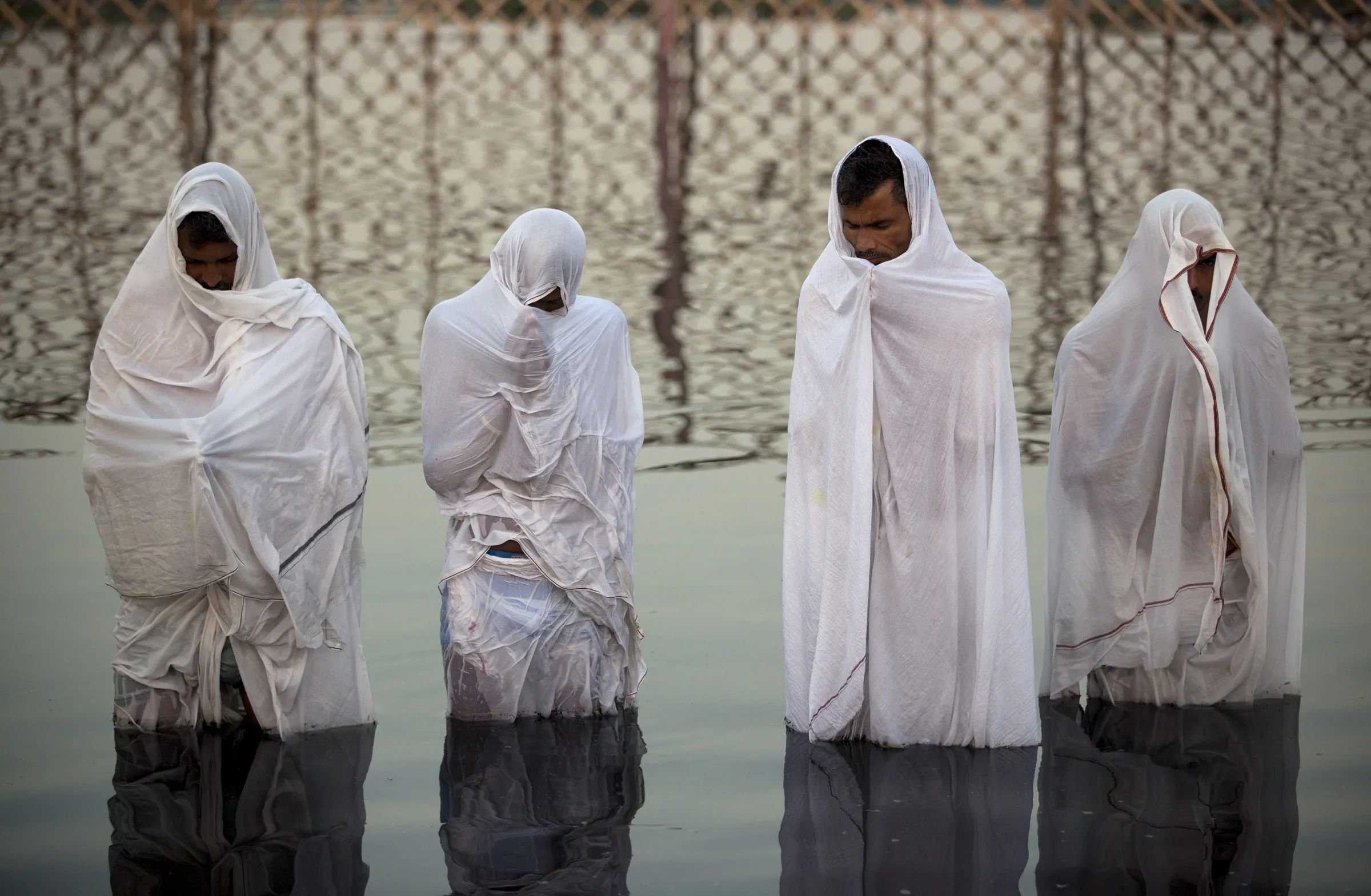 Indian Hindu devotees perform rituals at sunset in the Yamuna River during the Chhath Puja festival in New Delhi, India, Tuesday, November 17, 2015. During Chhath, an ancient Hindu festival, rituals are performed to thank the Sun god for sustaining life on earth. (Photo by Tsering Topgyal/AP Photo)