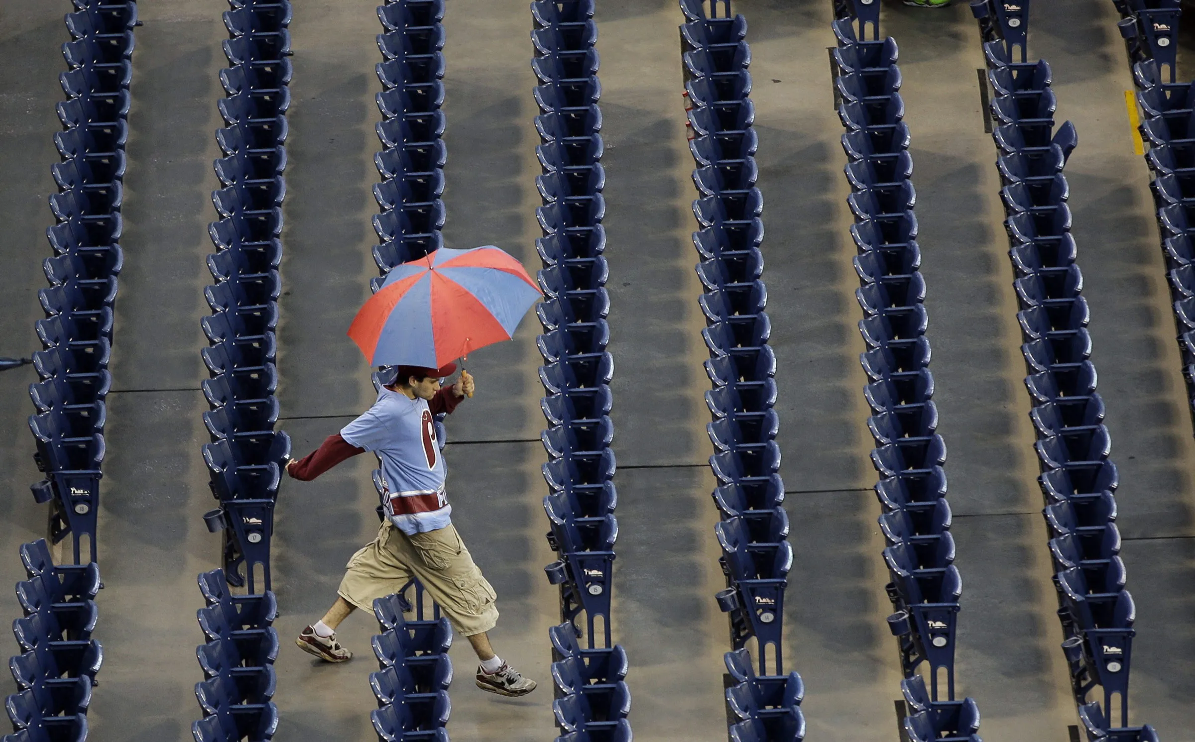 A Philadelphia Phillies' fan walks through the stands as rain delays the start of a baseball game against the Chicago Cubs, Saturday, September 12, 2015, in Philadelphia. (Photo by Matt Slocum/AP Photo)