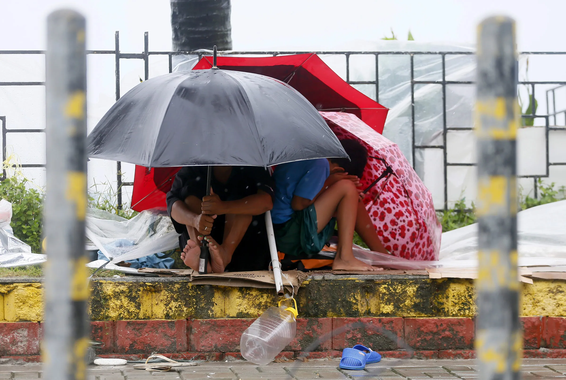 Residents huddle together under their umbrellas as strong winds and slight rain are brought by Typhoon Koppu Sunday, October 18, 2015 in Manila, Philippines. (Photo by Bullit Marquez/AP Photo)