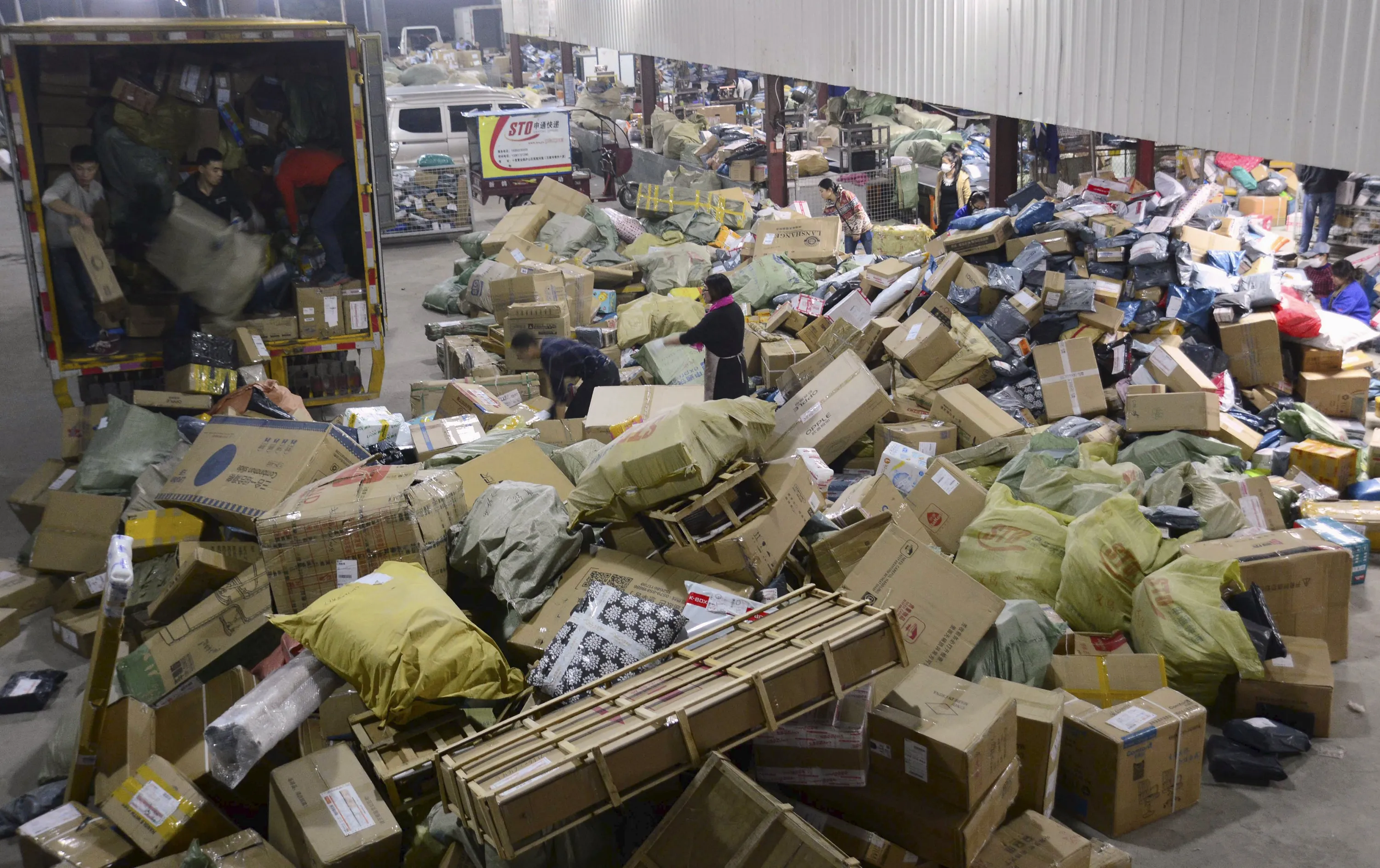 Workers unload boxes and parcels off a truck at a sorting centre of Shentong (STO) Express delivery company, after the Singles Day online shopping festival, in Jiujiang, Jiangxi province, November 15, 2015. (Photo by Reuters/China Daily)