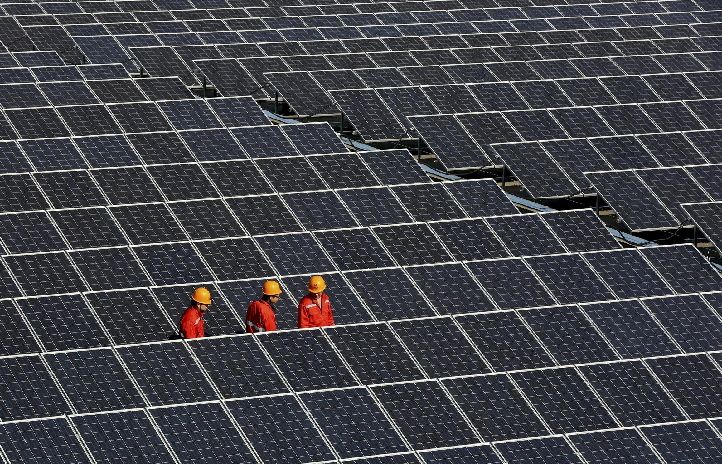 Workers walk among newly installed solar panels at a solar power plant in Zhouquan township of Tongxiang, Zhejiang province, China, in this December 18, 2014 file picture. Chinese solar companies will need to raise many billions of dollars in 2015 to fund a big expansion in capacity, a major test of investor confidence in a sector hit hard by the global financial crisis. (Photo by Reuters/Stringer)