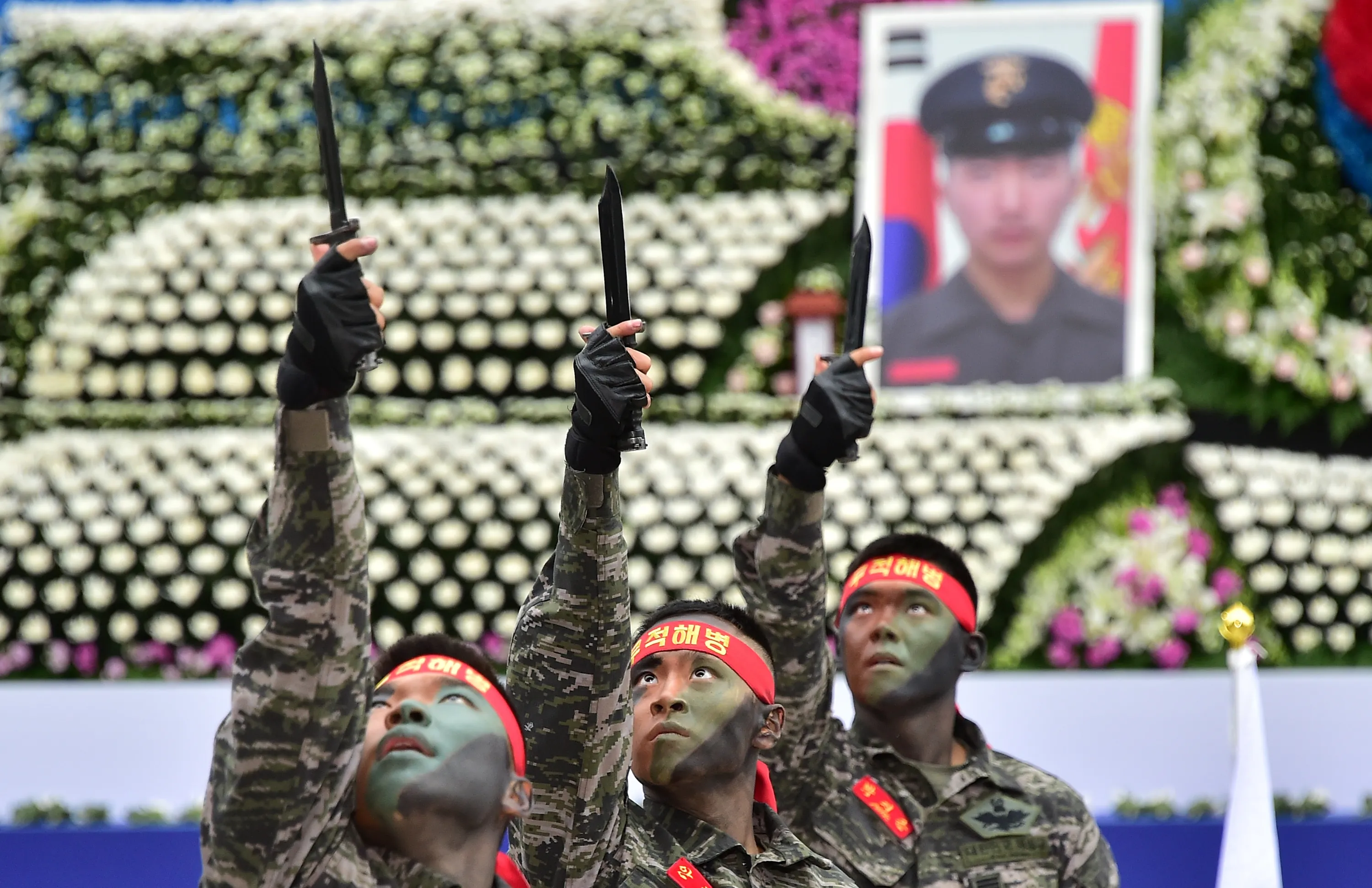 South Korean marines perform a martial art during a ceremony to commemorate the 5th anniversary of North Korea's shelling of Yeonpyeong Island at the War Memorial in Seoul on November 23, 2015. North Korea warned of "merciless" attacks on South Korean border islands if Seoul stages live-fire drills near the maritime border on the fifth anniversary of Pyongyang's deadly shelling attack. (Photo by Jung Yeon-Je/AFP Photo)