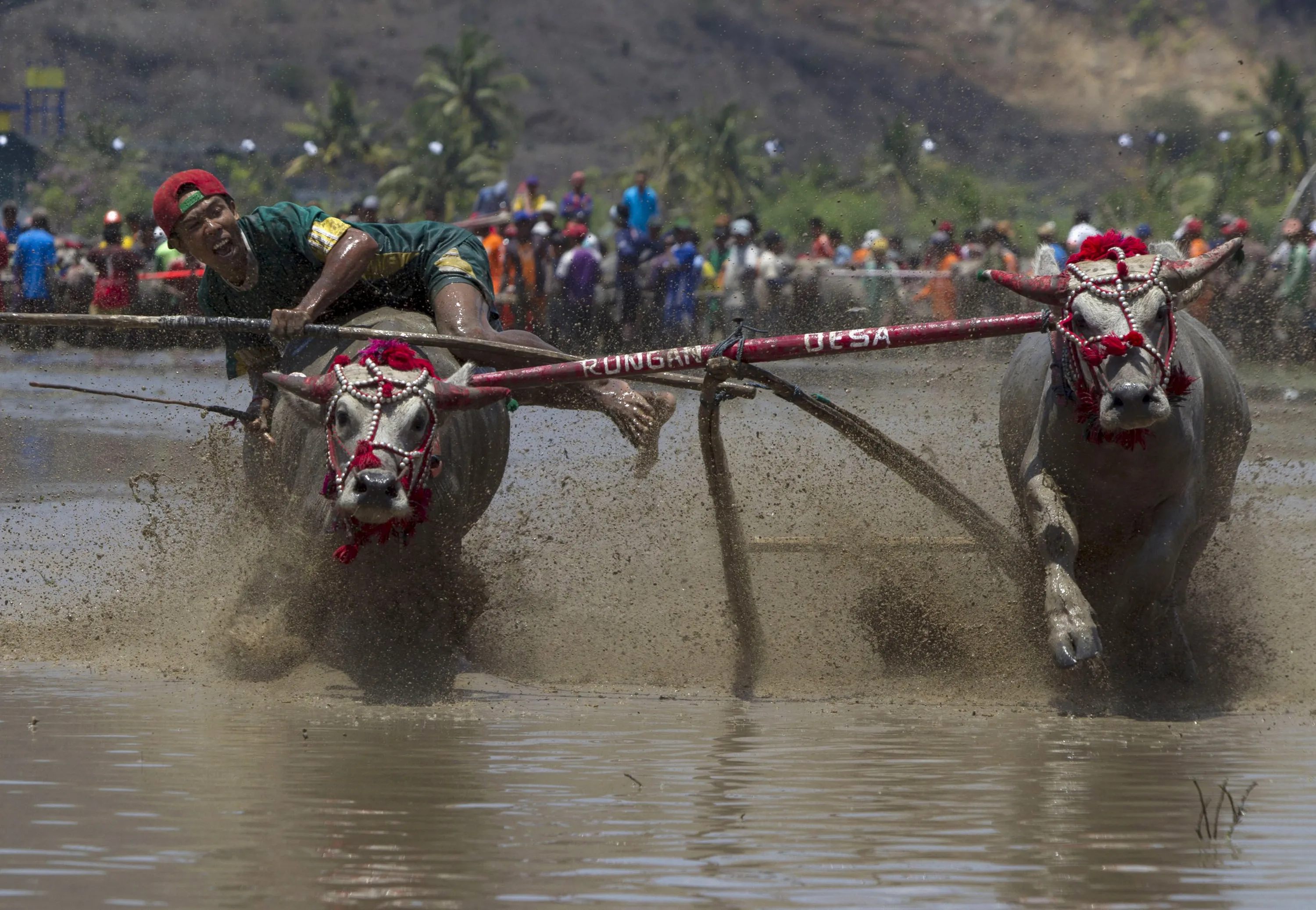 A jockey tries to control his water buffalo during a traditional Barapan Kebo or buffalo races, in Taliwang, on the island of Sumbawa, West Nusa Tenggara, Indonesia November 22, 2015. (Photo by Sigit Pamungkas/Reuters)