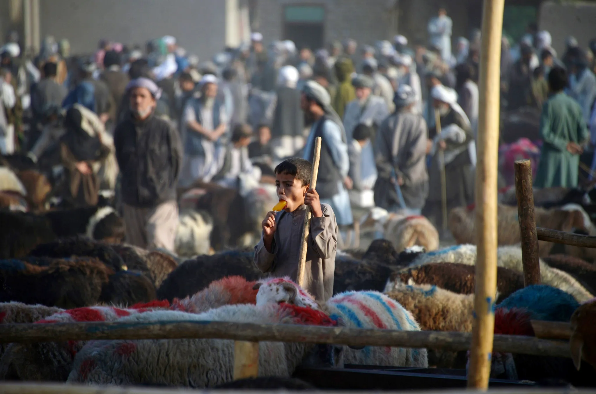 An Afghan boy eats an ice cream as he waits for customers at a livestock market ahead of the sacrificial Eid al-Adha festival in Mazar-i-Sharif on September 21, 2015. Muslims across the world are preparing to celebrate annual festival of Eid al-Adha or the festival of sacrifice which marks the end of the Hajj pilgrimage to Mecca and commemorates prophet Abraham's readiness to sacrifice his son to show obedience to God. (Photo by Farshad Usyan/AFP Photo)