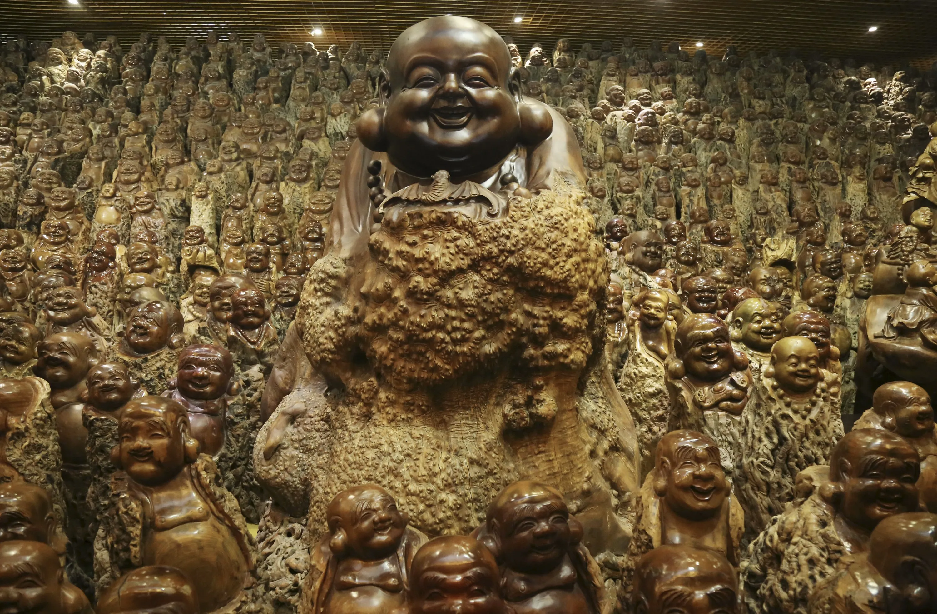 Buddha sculptures made of trunks of Chinese date trees are seen inside a room of a company selling dates, in Zhengzhou, Henan province, China, November 23, 2015. The room contains over 9,200 different buddha scluptures made of discarded Chinese date tree trunks, local media reported. (Photo by Reuters/Stringer)