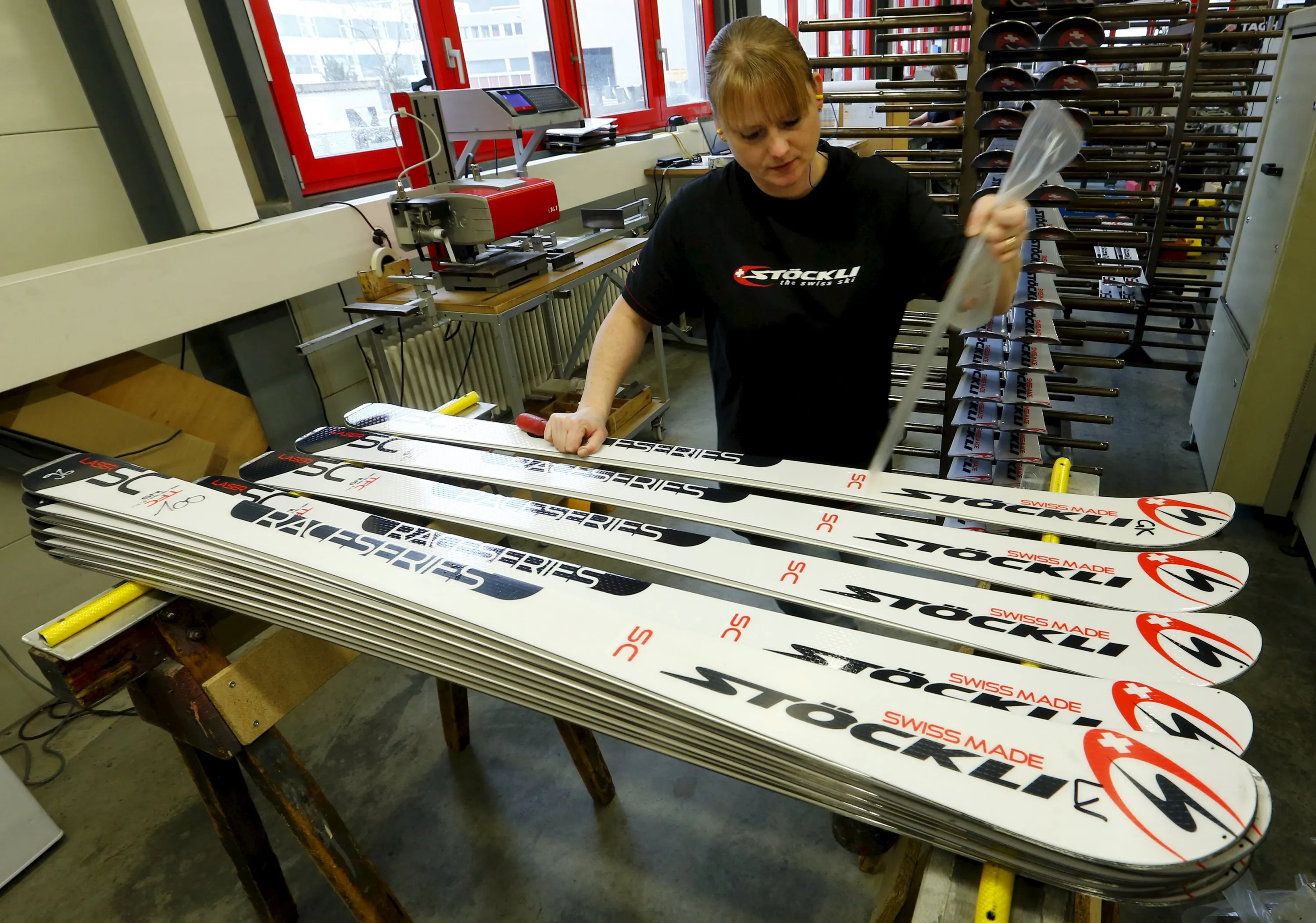 An employee prepares skis before waxing them at the plant of Swiss ski manufacturer Stoeckli in Malters, Switzerland November 25, 2015. (Photo by Arnd Wiegmann/Reuters)