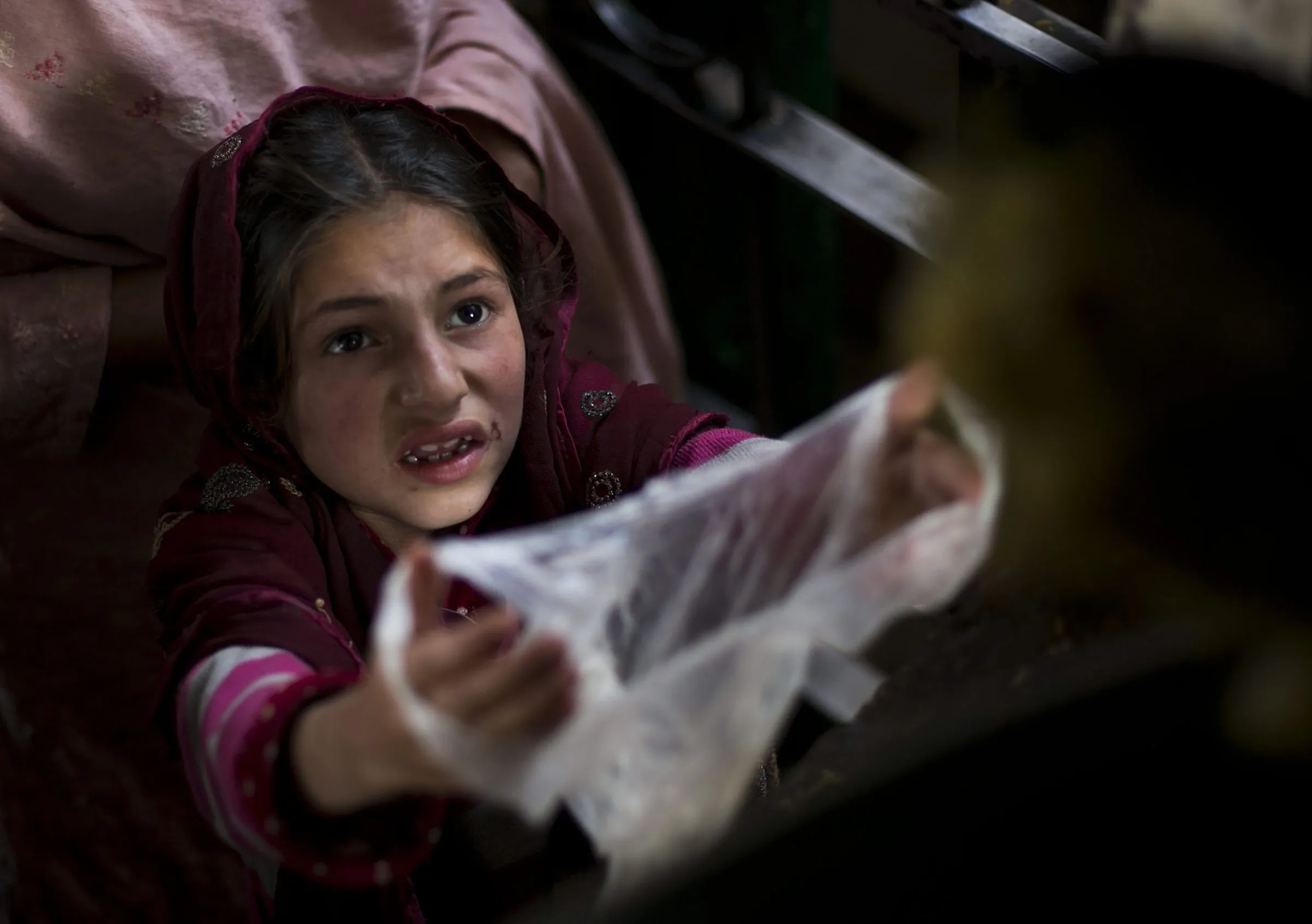 A Pakistani poor girl extends her plastic bag to receive free food for her family, distributed at local shrine in suburbs of Islamabad, Pakistan, Friday, November 20, 2015. Pakistan also observed Universal Children's Day, which is marked annually by the United Nations with other nations. (Photo by B.K. Bangash/AP Photo)