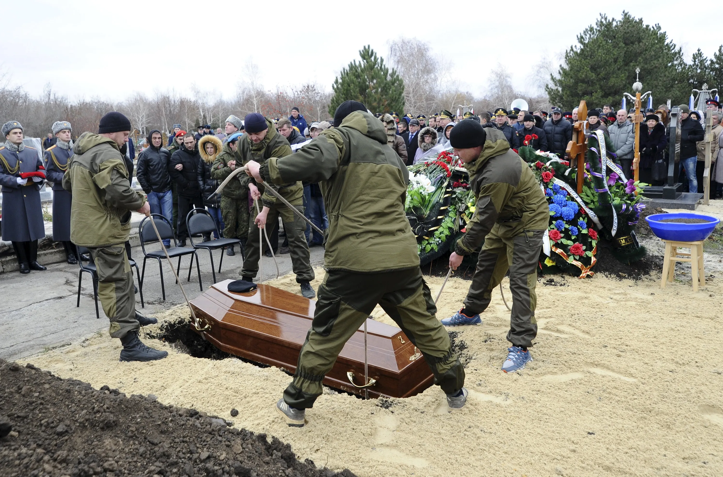 Men lower the coffin into the ground during the funeral of Alexander Pozynich, a Russian marine killed during an operation to recover the crew of the downed Su-24 jet, at a cemetery in Novocherkassk, Rostov region, Russia, November 27, 2015. (Photo by Sergey Pivovarov/Reuters)