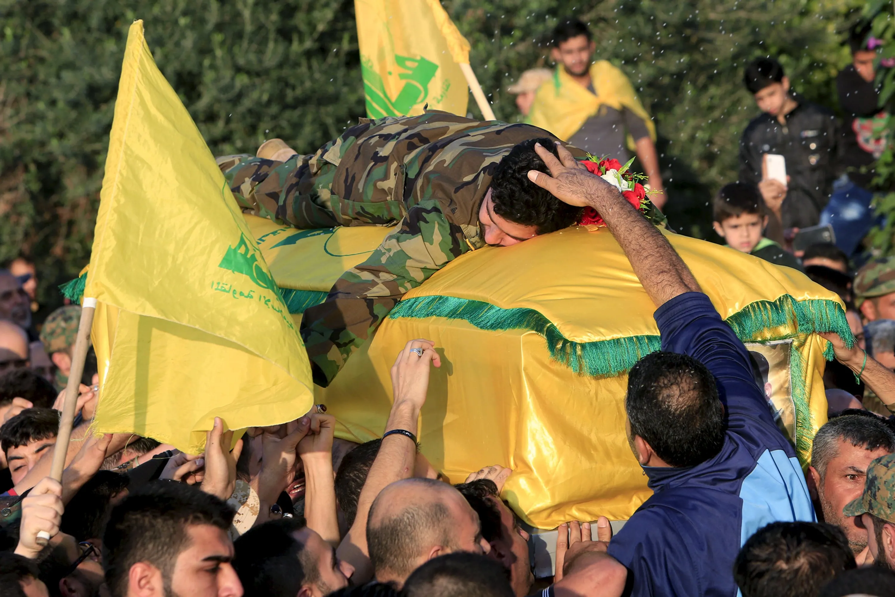 Brother of Ali Tnana, a Lebanon's Hezbollah member who was killed fighting alongside Syrian army forces in Syria, lays on his coffin during his funeral in Saksakieh village, southern Lebanon, November 27, 2015. (Photo by Ali Hashisho/Reuters)