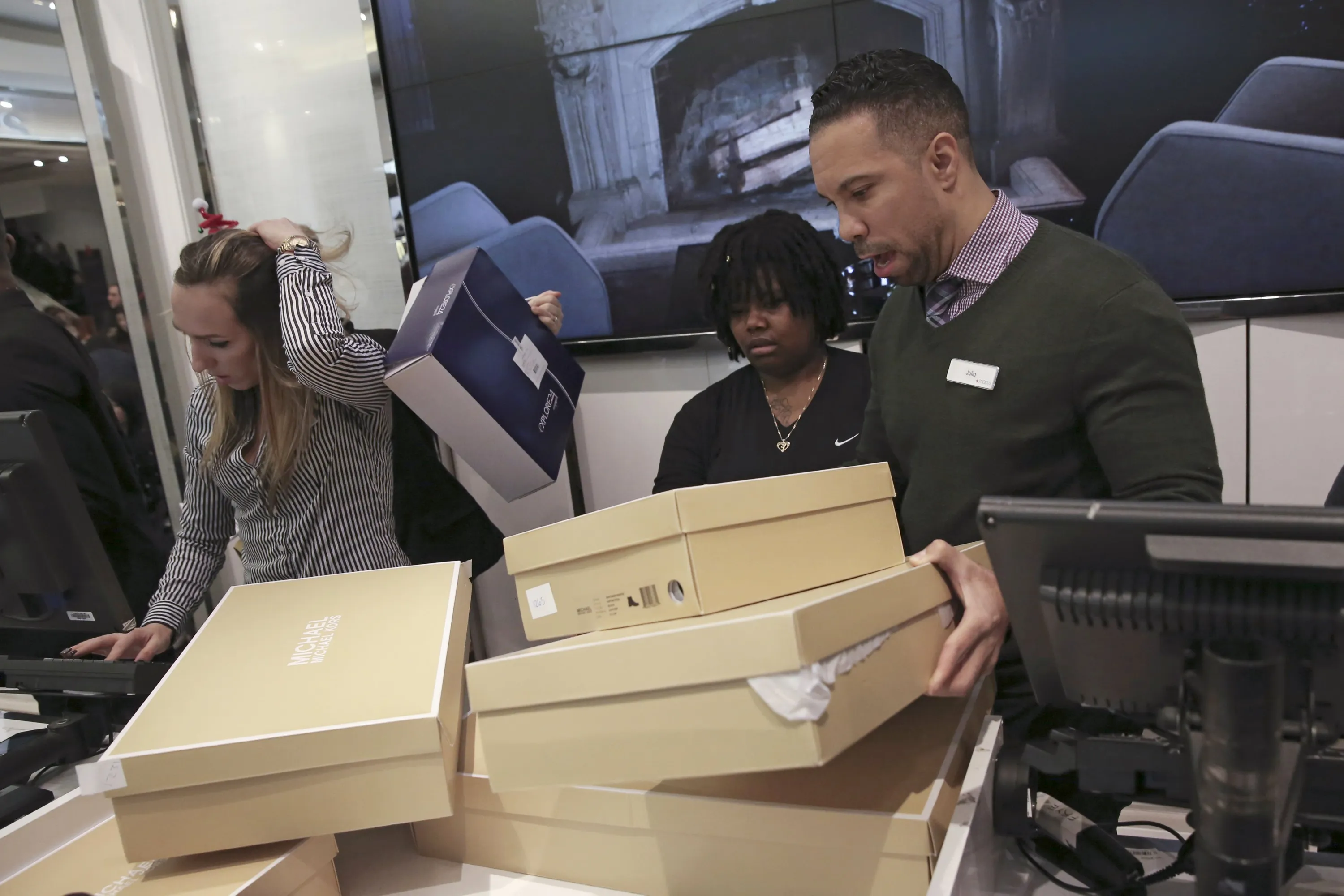 Staff members arrange shoe boxes at Macy's Herald Square store during the early opening of the Black Friday sales in the Manhattan borough of New York, November 26, 2015. (Photo by Andrew Kelly/Reuters)