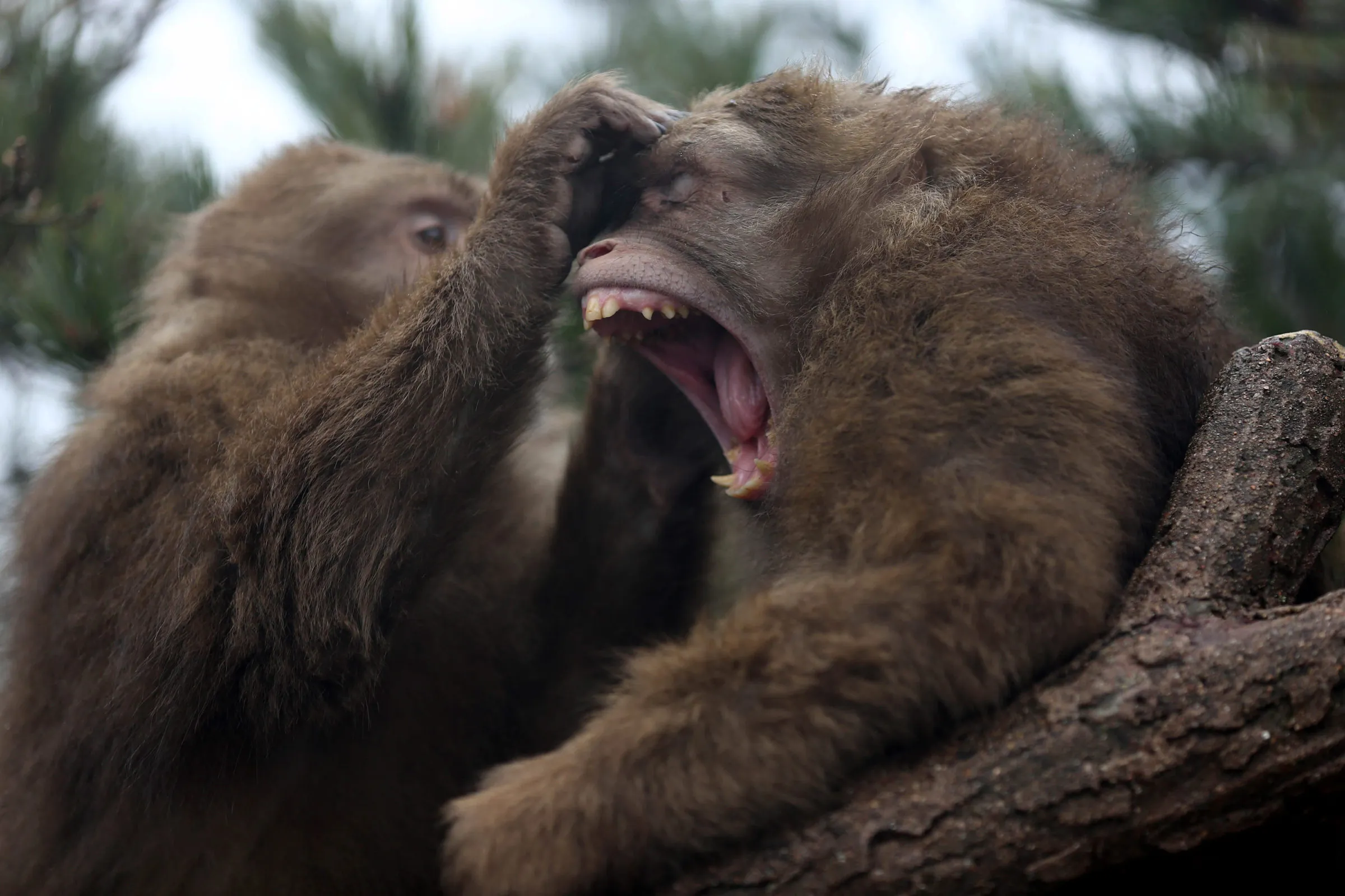 Two macaques play together in Lion Peak of Yellow Mountain after the snow has cleared on November 25, 2015 in Huangshan, Anhui Province of China. (Photo by ChinaFotoPress/ChinaFotoPress via Getty Images)