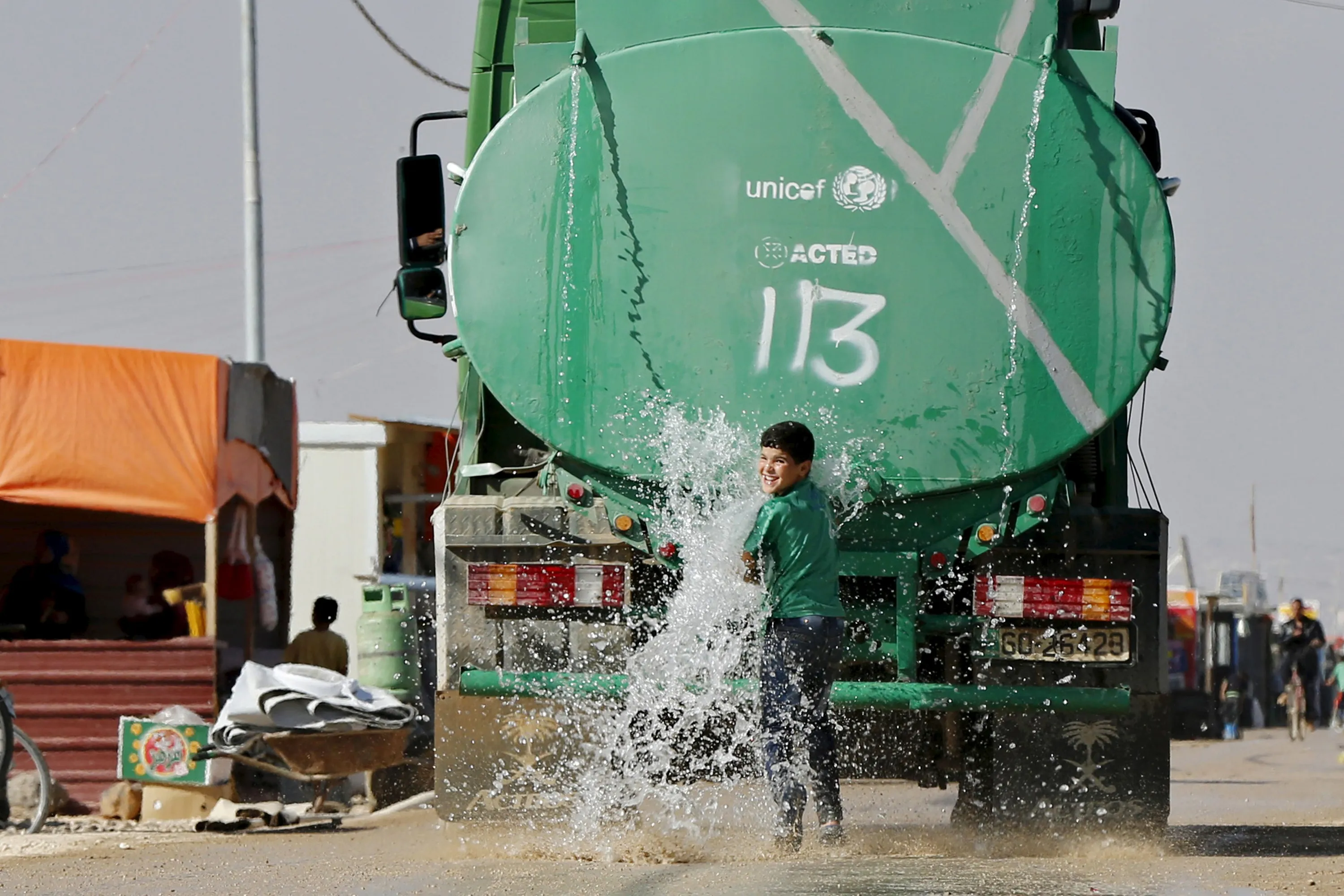 A Syrian refugee child plays in the water from the back of a water tanker at Al Zaatari refugee camp, in the Jordanian city of Mafraq, near the border with Syria, November 29, 2015. (Photo by Muhammad Hamed/Reuters)