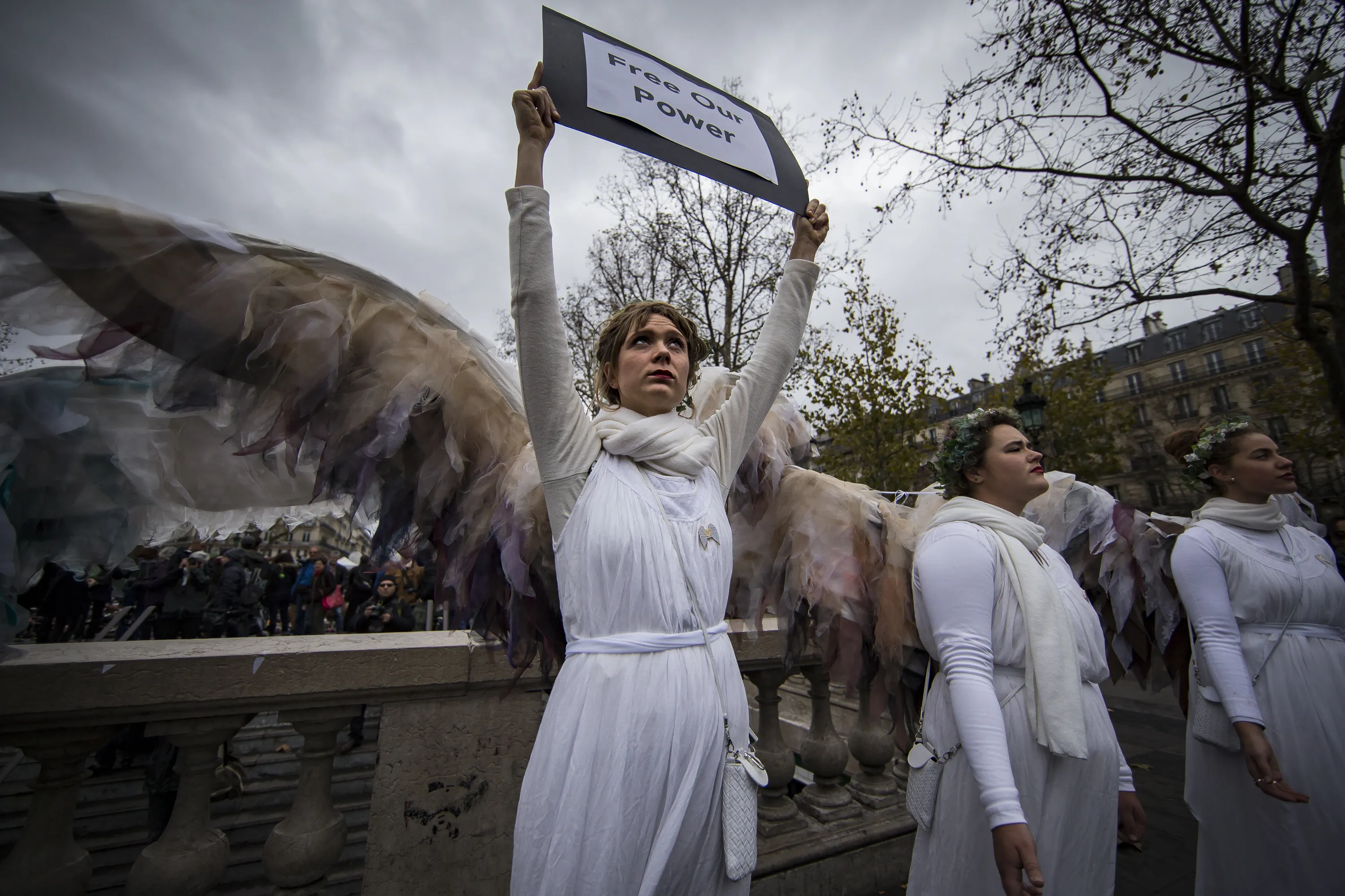 Protestors dressed as angels hold signs as they participate in the human chain demonstration at Republique Square on the eve of the COP21 Conference opening, Paris, France, Sunday, November 29, 2015. (Photo by Ian Langsdon/EPA)